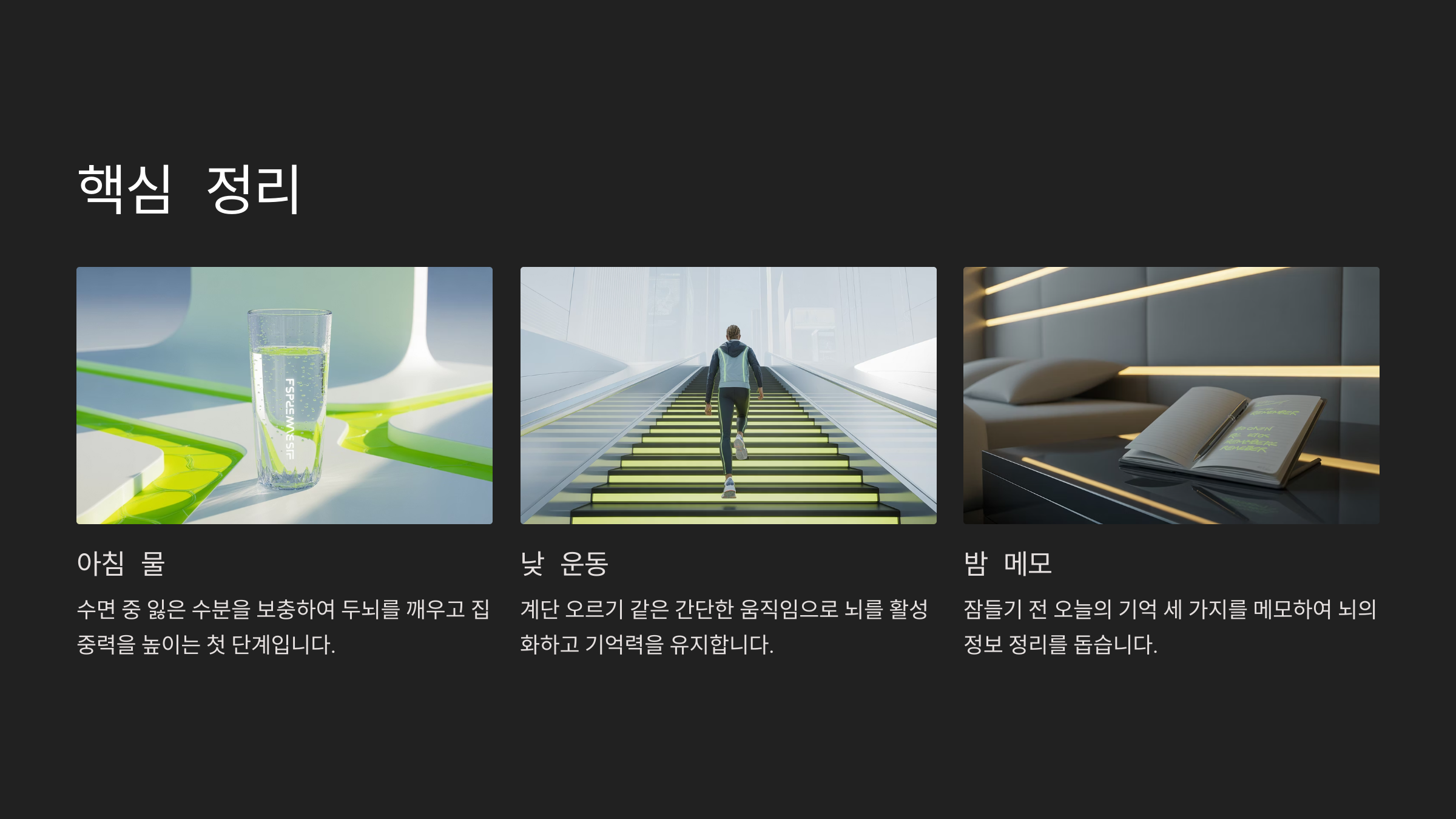 루틴 실천 중 | 집중력 상승, 기억 유지 | 아침 물, 낮 운동, 밤 메모 |