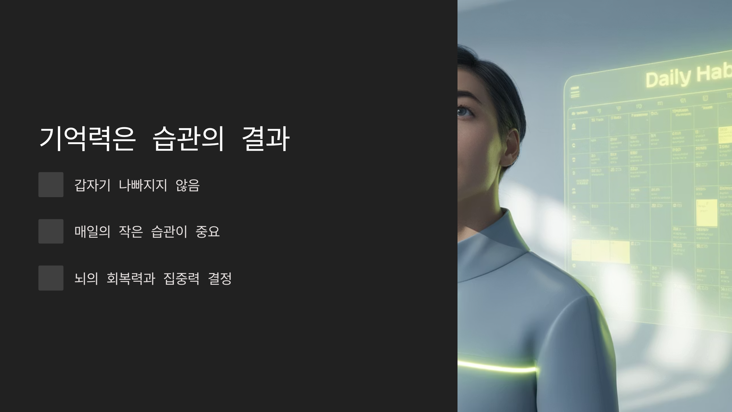 | 루틴 실천 중 | 집중력 상승, 기억 유지 | 아침 물, 낮 운동, 밤 메모 |