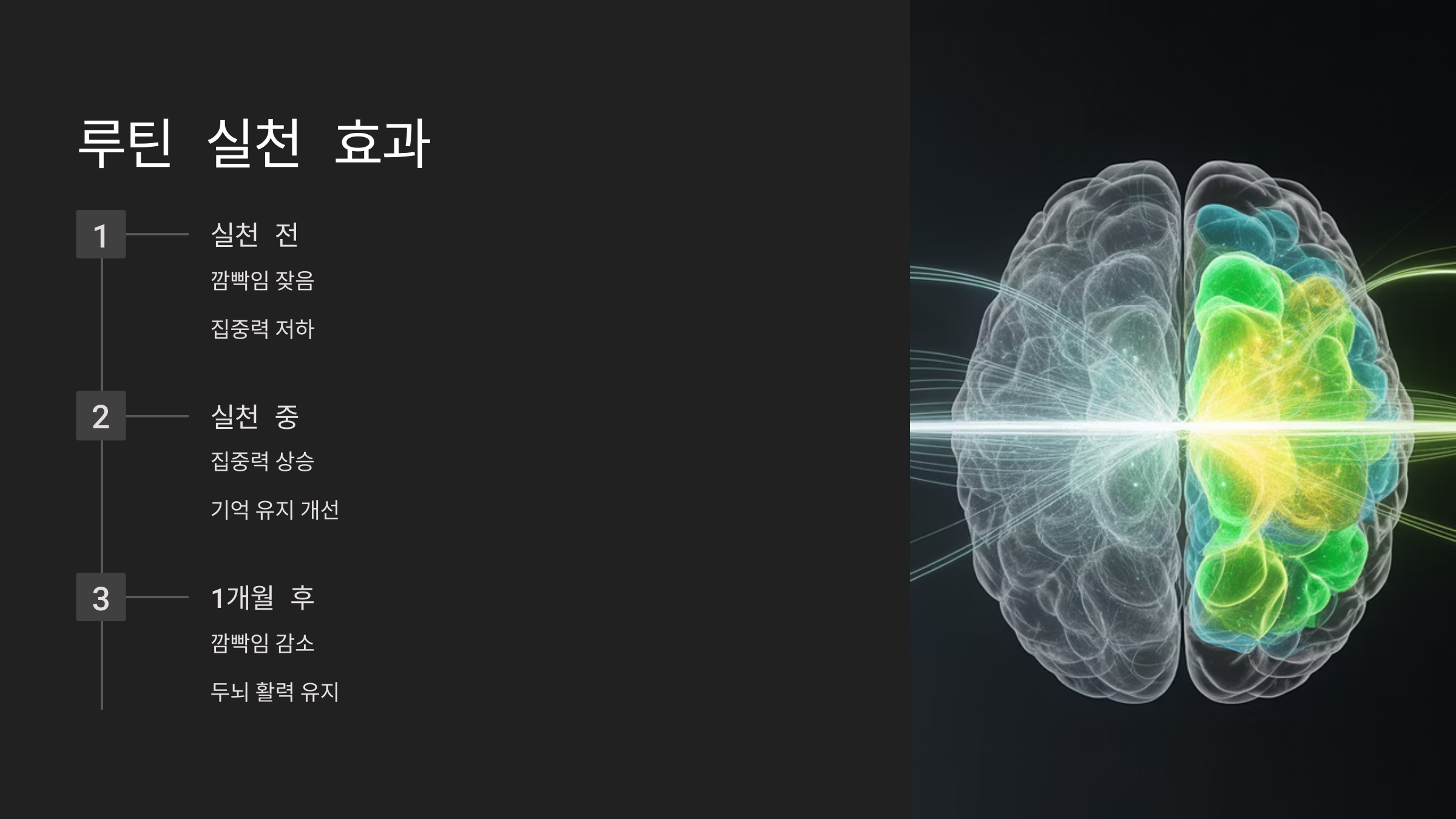 | 루틴 실천 1개월 | 깜빡임 감소, 두뇌 활력 유지 | 꾸준한 반복 |