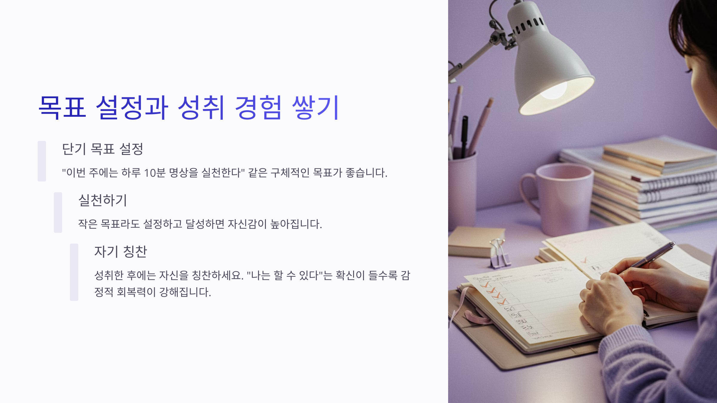 작은 목표라도 설정하고 달성하면 자신감이 높아지고 감정적 회복력이 향상됩니다.