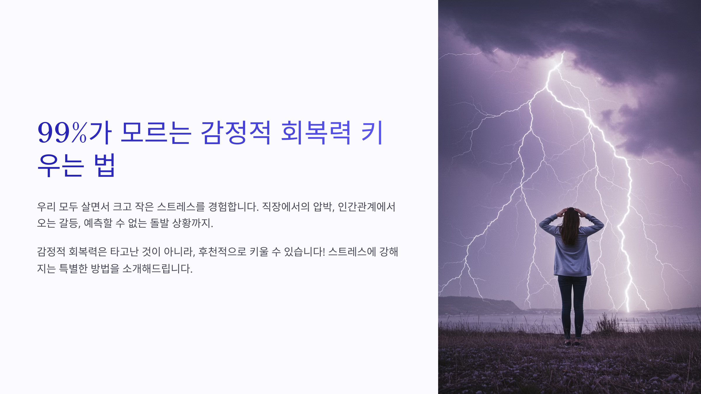 하지만 놀라운 사실이 있습니다. 감정적 회복력은 타고난 것이 아니라, 후천적으로 키울 수 있다는 점입니다! 오늘은 99%가 모르는, 스트레스에 강해지는 특별한 방법을 소개해드립니다. 끝까지 읽으시면 삶을 더 긍정적으로 변화시킬 실천법을 알게 될 것입니다.