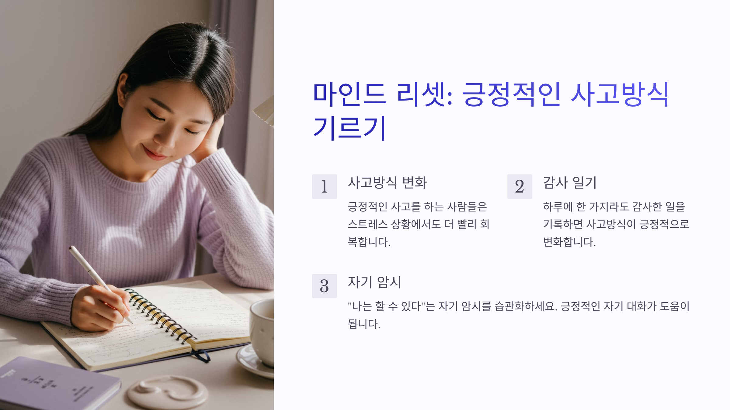 감정적 회복력을 키우기 위해 가장 중요한 것은 사고방식을 바꾸는 것입니다. 연구에 따르면 긍정적인 사고를 하는 사람들은 스트레스 상황에서도 더 빨리 회복합니다.