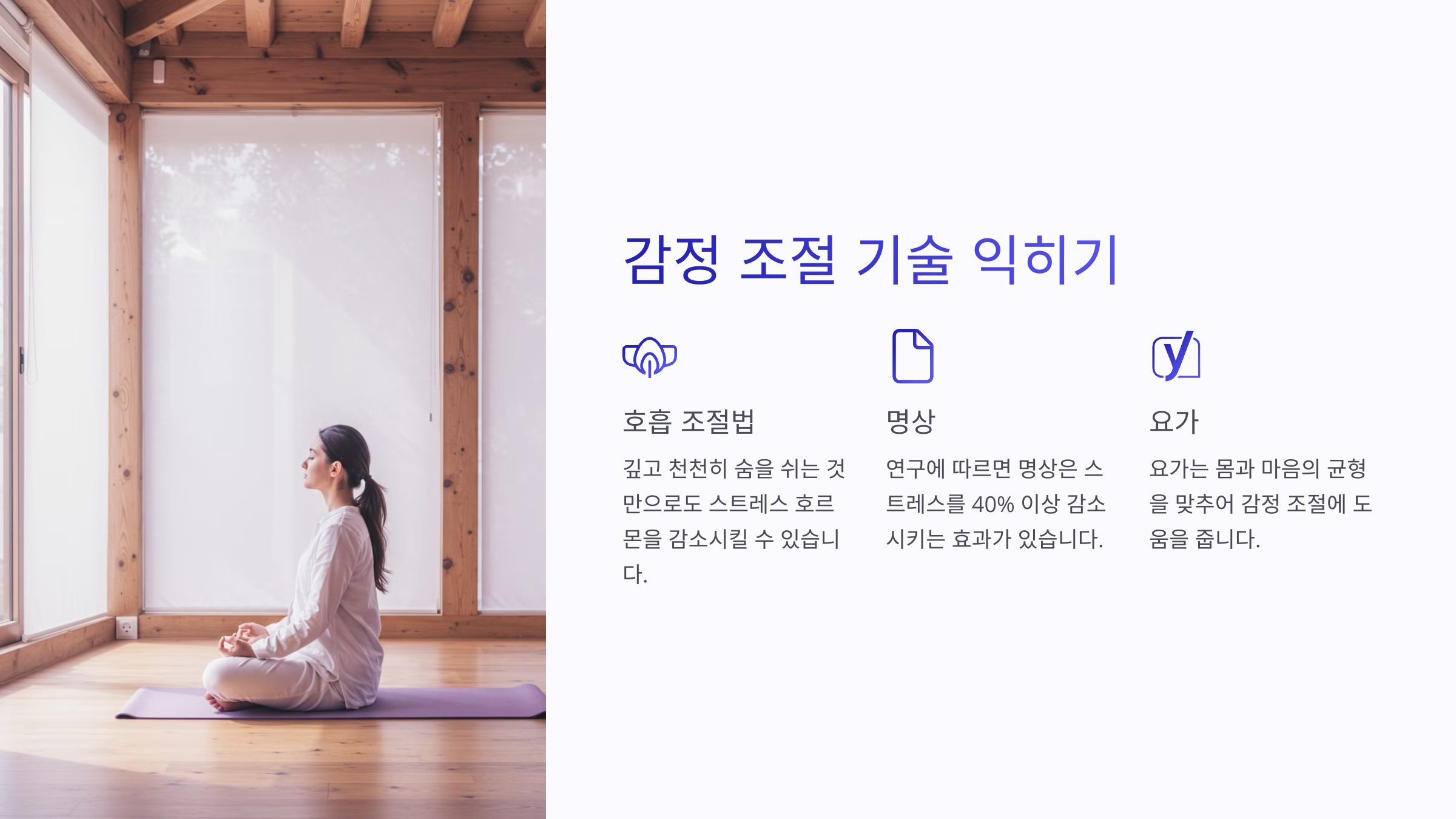 💡 지금 바로 실천해 보세요! 오늘 하루만이라도 감사 일기를 써보거나, 명상을 시도해 보는 건 어떨까요?