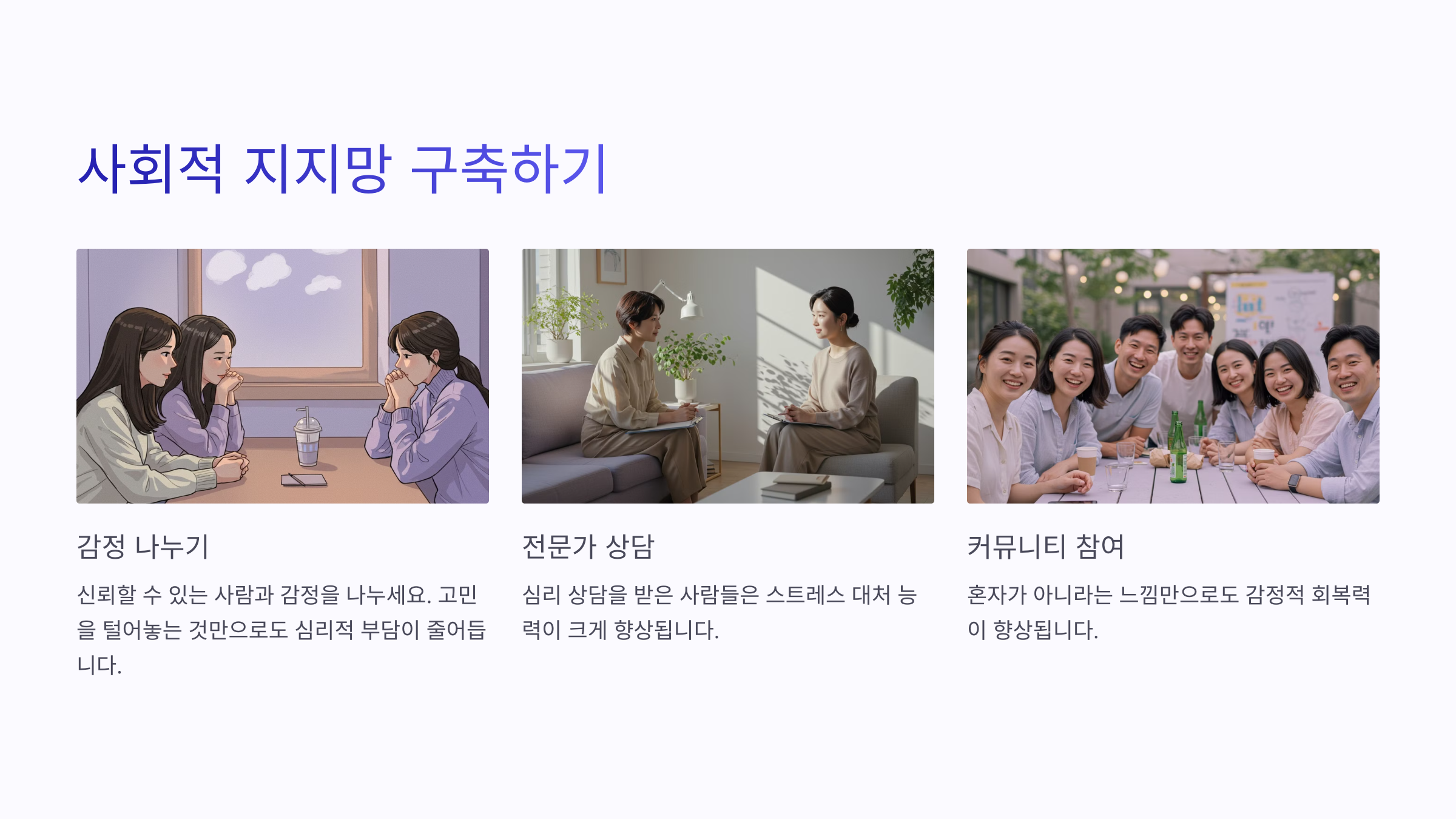 혼자가 아니라는 느낌만으로도 감정적 회복력이 향상됩니다. 연구에 따르면 사회적 지원이 강한 사람들은 스트레스 상황에서도 더 빠르게 회복합니다.