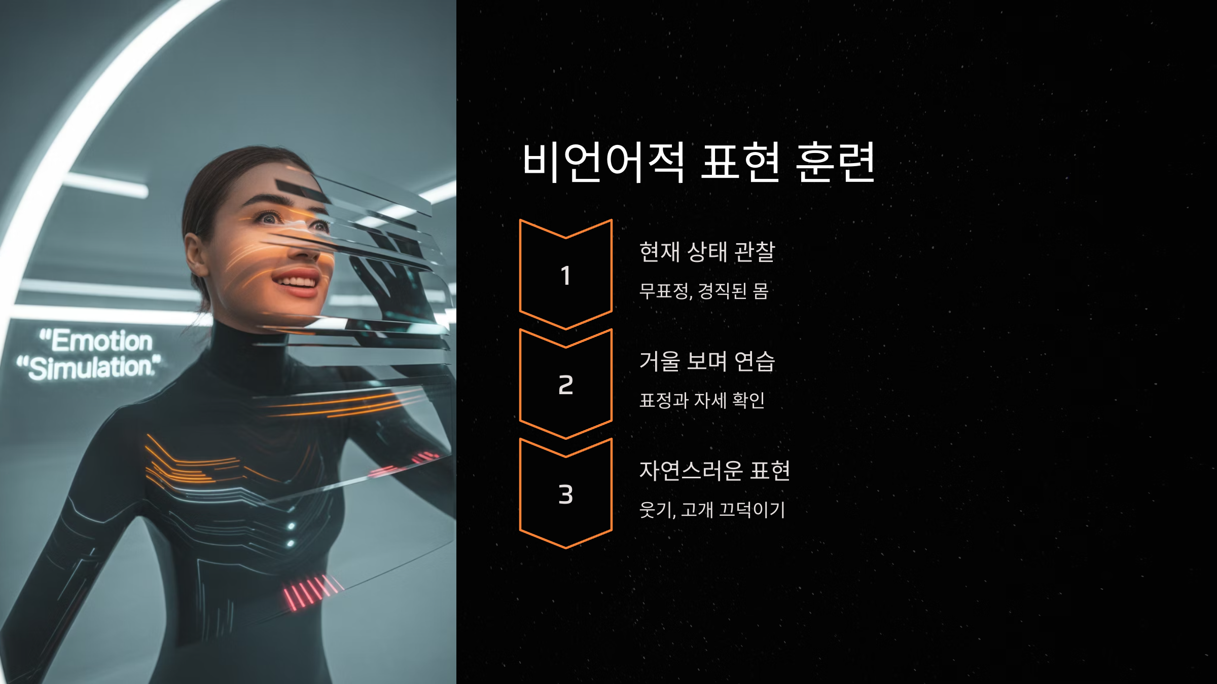 감정을 억누르다 보면 무표정해지고 몸은 경직됩니다. 거울을 보며 자신의 표정과 자세를 관찰하고, 웃거나 고개를 끄덕이는 등의 자연스러운 표현을 연습해 보세요.