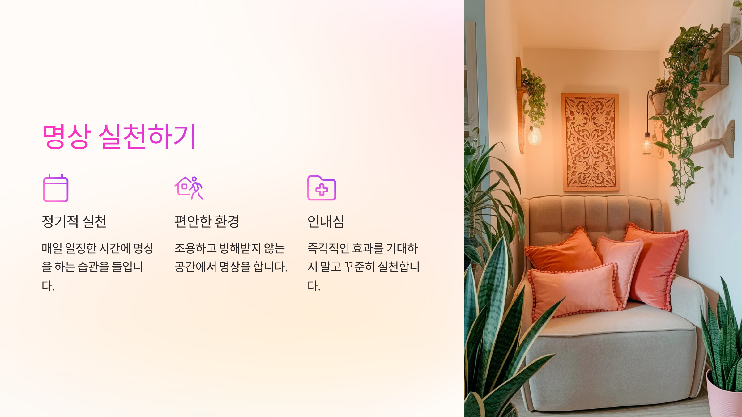 명상을 할 때는 편안한 환경이 필요합니다. 조용하고 방해받지 않는 공간에서 명상을 하면 더욱 효과적입니다. 또한, 편안한 자세를 유지하는 것이 중요합니다.