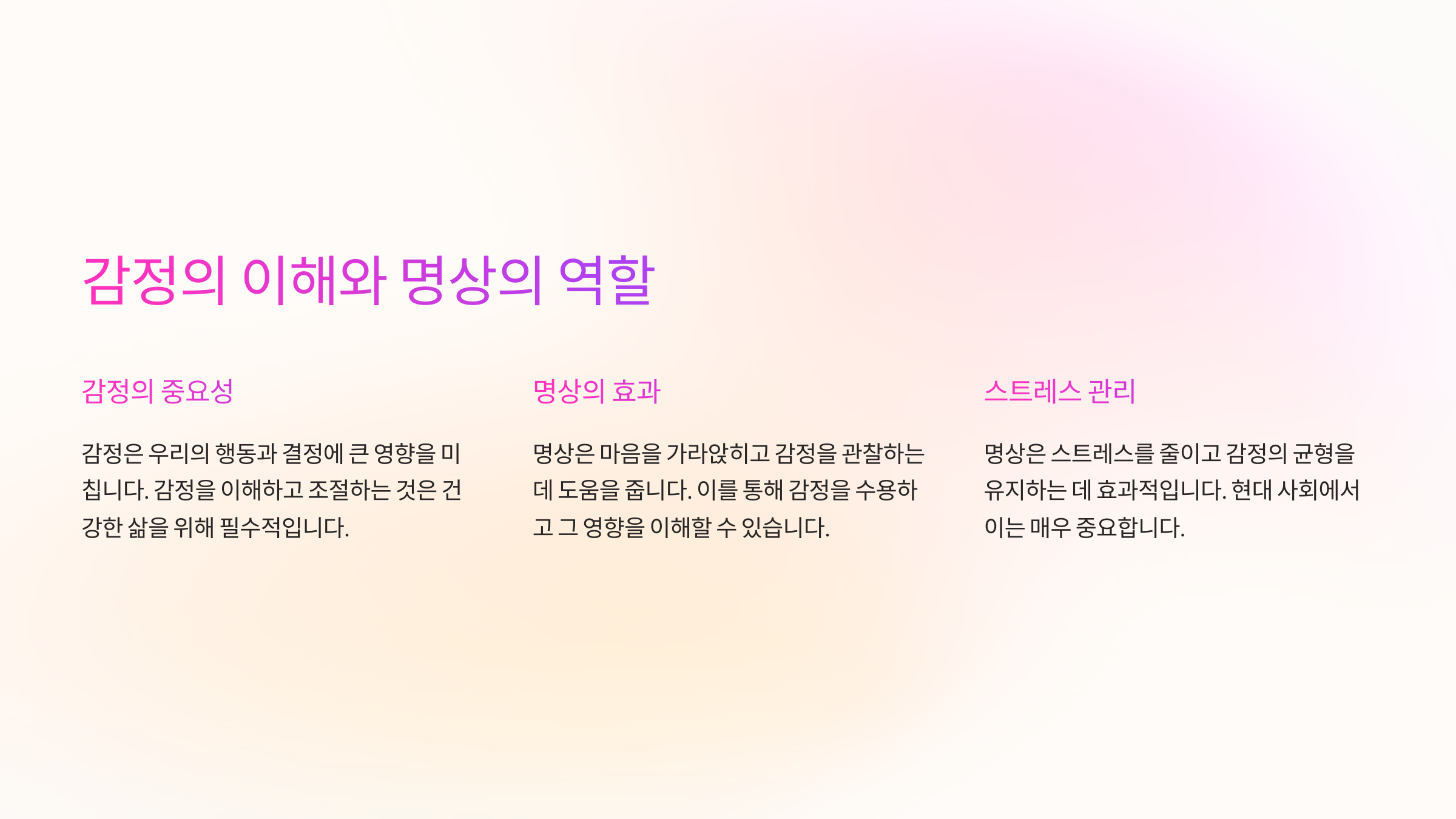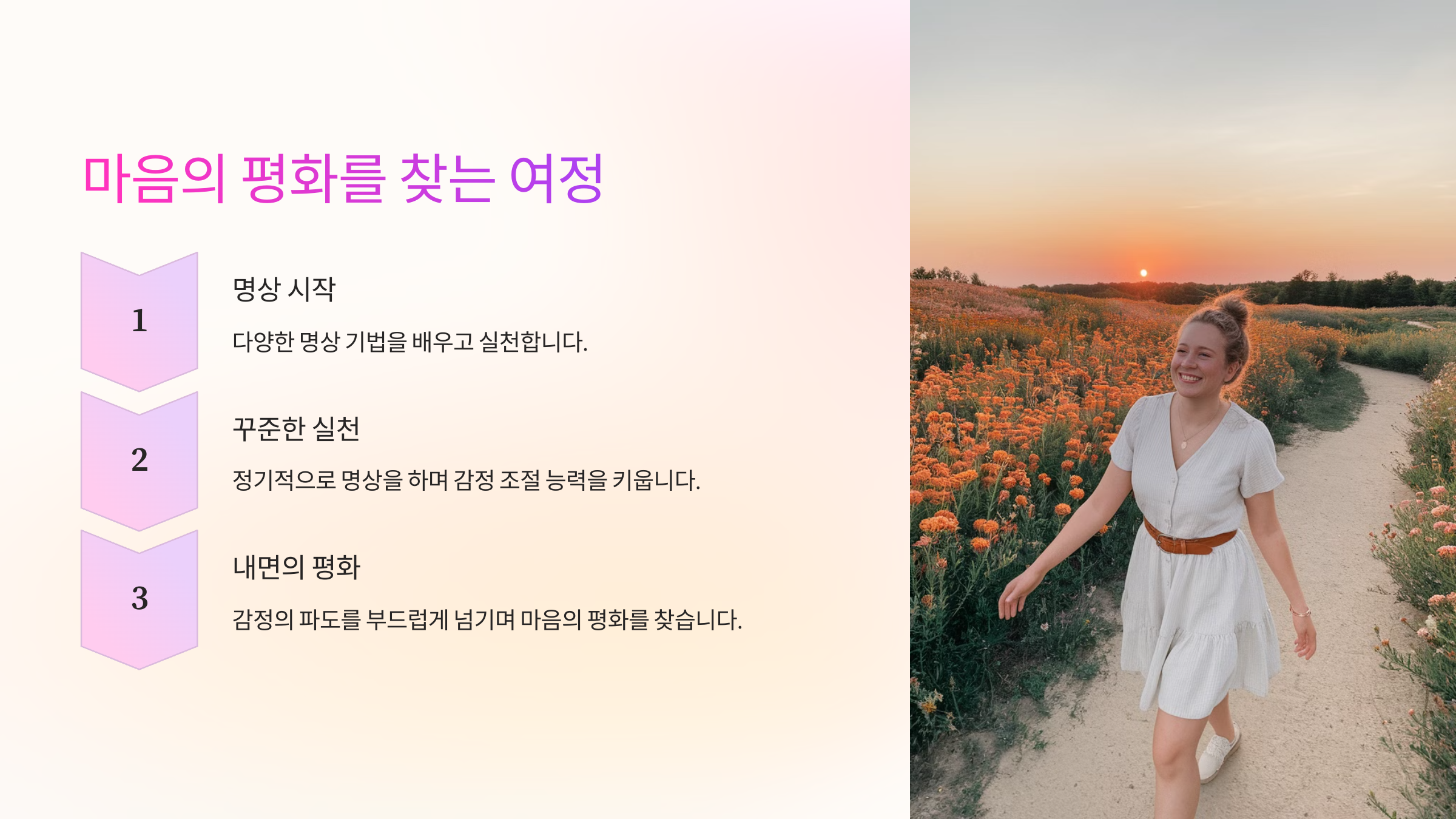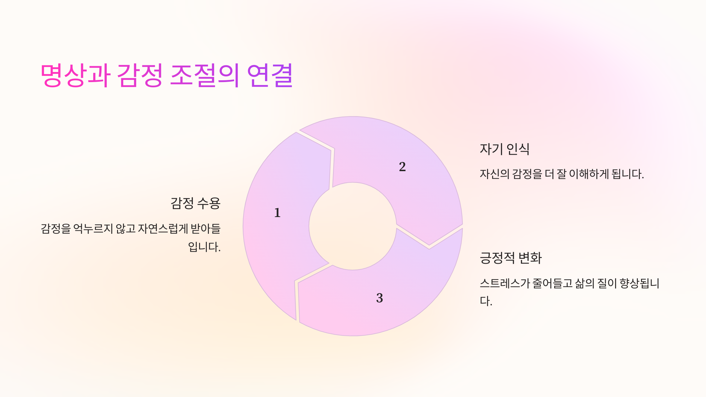 명상은 긍정적인 변화를 가져옵니다. 감정 조절 능력이 향상되면, 스트레스가 줄어들고, 전반적인 삶의 질이 향상됩니다.