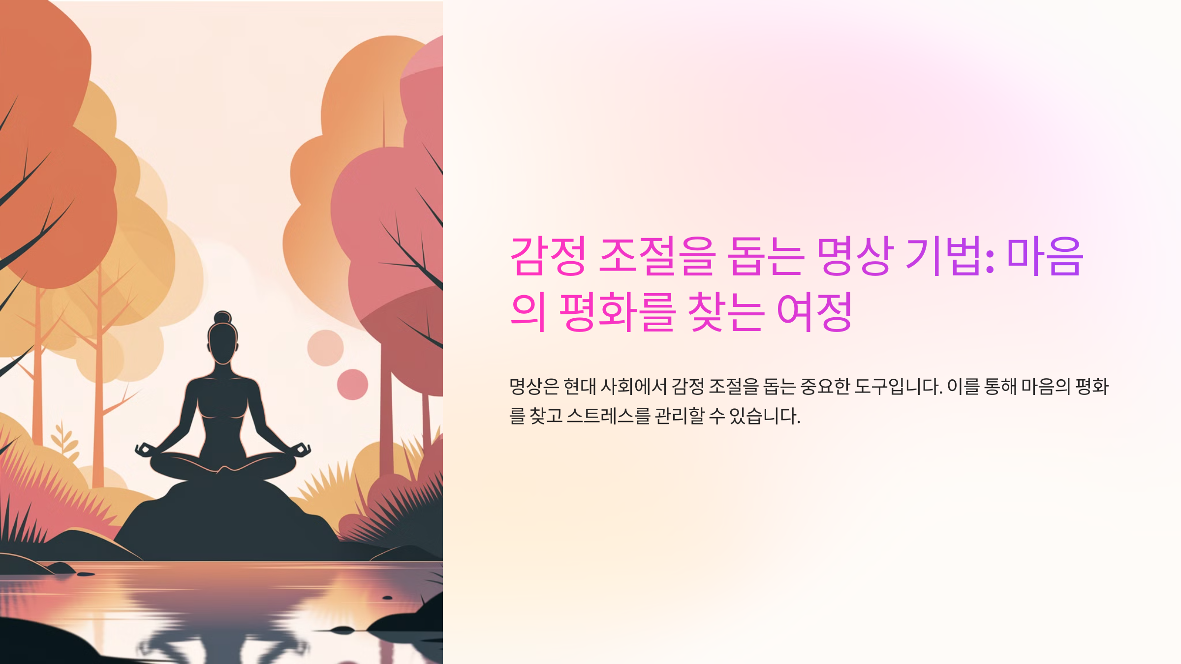 명상은 현대 사회에서 감정 조절을 돕는 중요한 도구로 자리 잡고 있습니다. 우리는 일상에서 다양한 스트레스와 감정의 파도에 휘말리기 쉽습니다. 이러한 상황에서 명상은 마음을 안정시키고, 감정을 조절하는 데 큰 도움을 줄 수 있습니다. 이 글에서는 감정 조절을 위한 명상 기법에 대해 알아보고, 이를 통해 어떻게 마음의 평화를 찾을 수 있는지에 대해 자세히 설명하겠습니다.