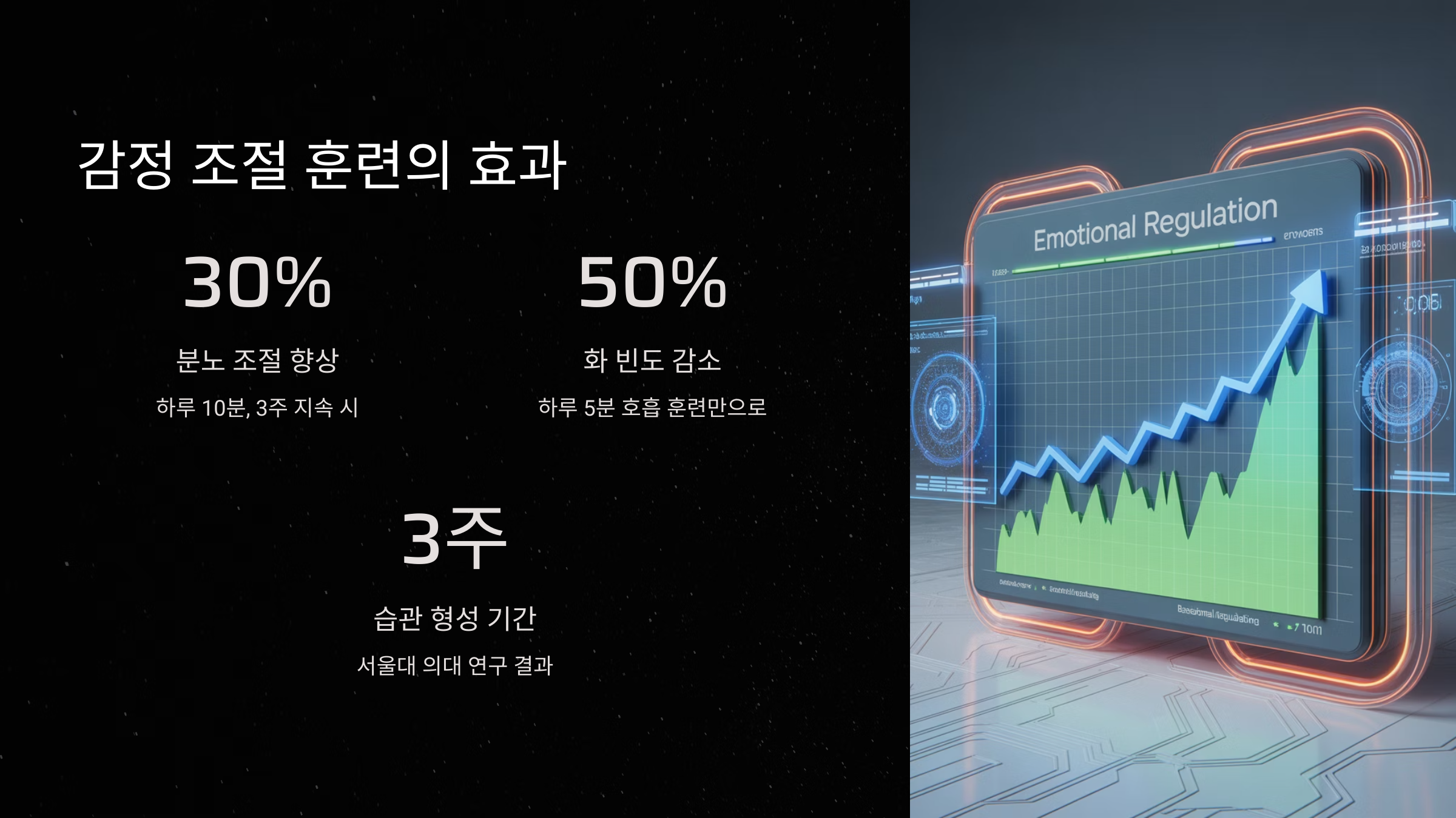 서울대 의대 연구에 따르면, 하루 10분 감정 인식 훈련을 3주간 지속하면 분노 조절 능력이 30% 향상된다는 결과가 있습니다.