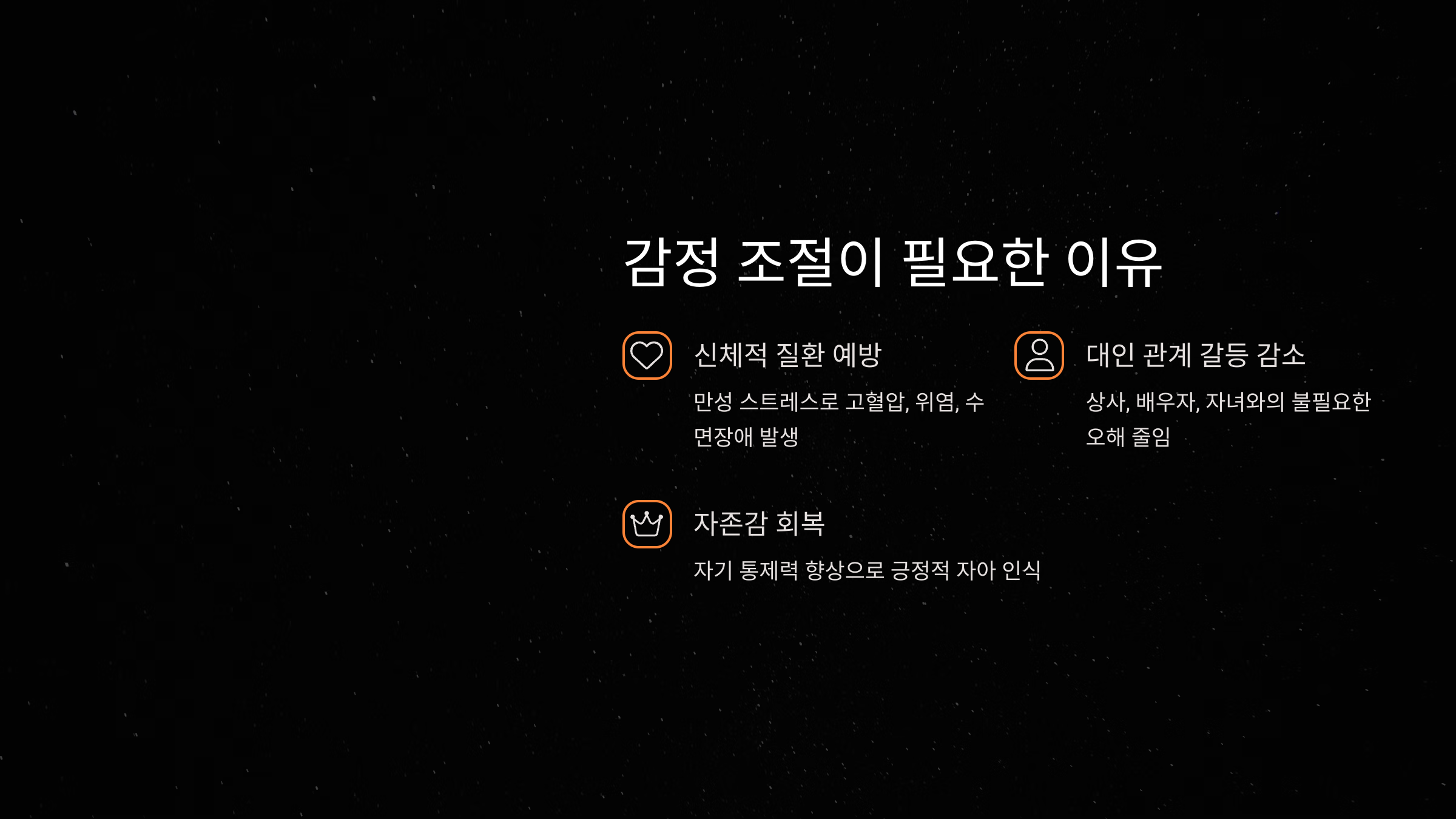 상사나 배우자, 자녀와의 갈등은 대부분 감정의 폭발에서 비롯됩니다. 훈련을 통해 말과 행동을 조절하면 불필요한 오해나 싸움을 줄일 수 있습니다. 이는 중년의 평온한 삶을 위한 핵심 요소입니다.