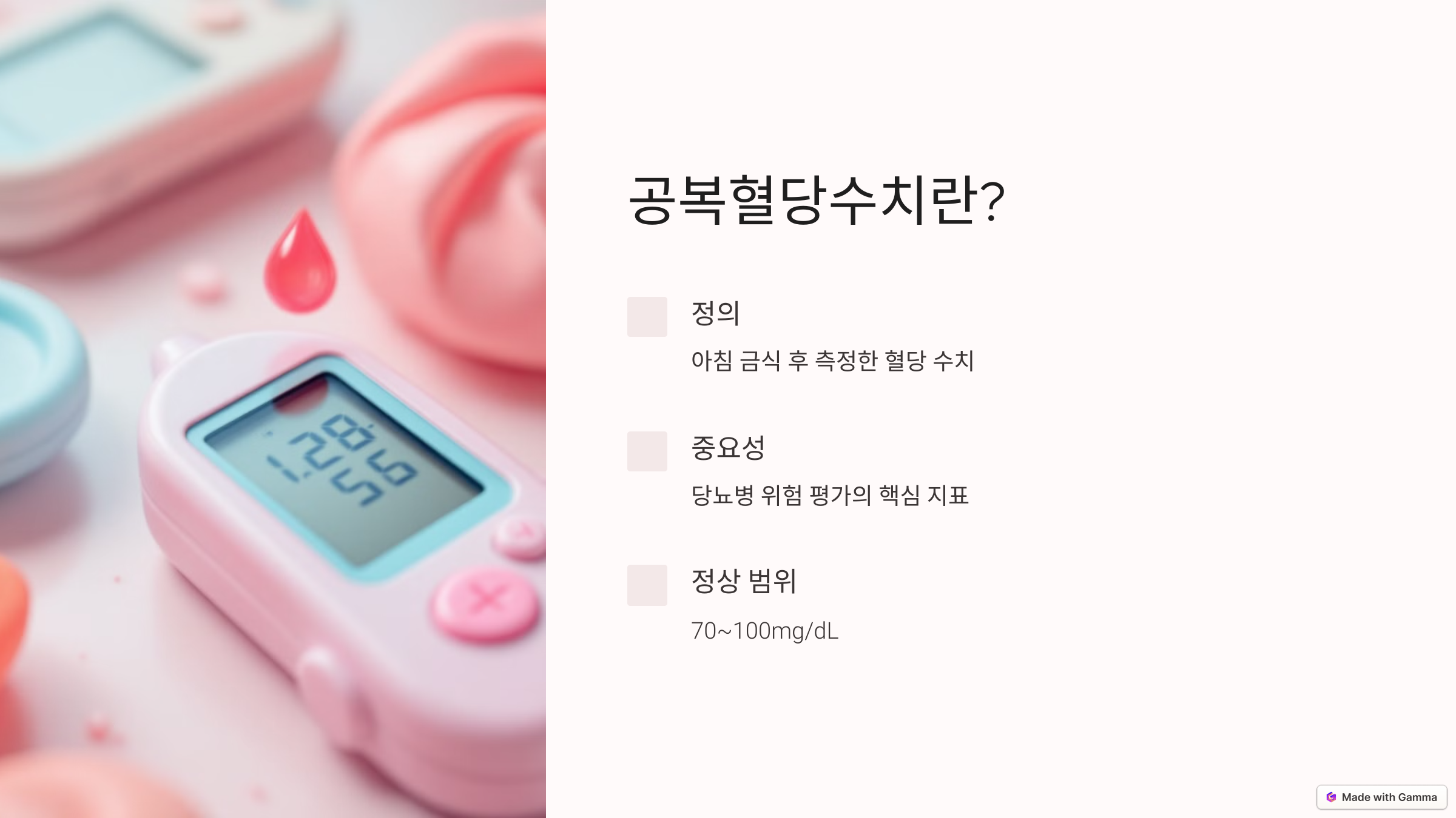 공복혈당수치는 아침에 일어난 후 아무것도 먹지 않은 상태에서 측정한 혈당 수치를 의미합니다. 이는 우리 몸의 인슐린 반응과 혈당 조절 능력을 평가하는 중요한 지표입니다. 정상 범위는 70~100mg/dL로, 이 수치가 높아질수록 당뇨병의 위험이 커집니다. 공복혈당수치는 마치 우리의 건강을 진단하는 첫 번째 신호와 같습니다.