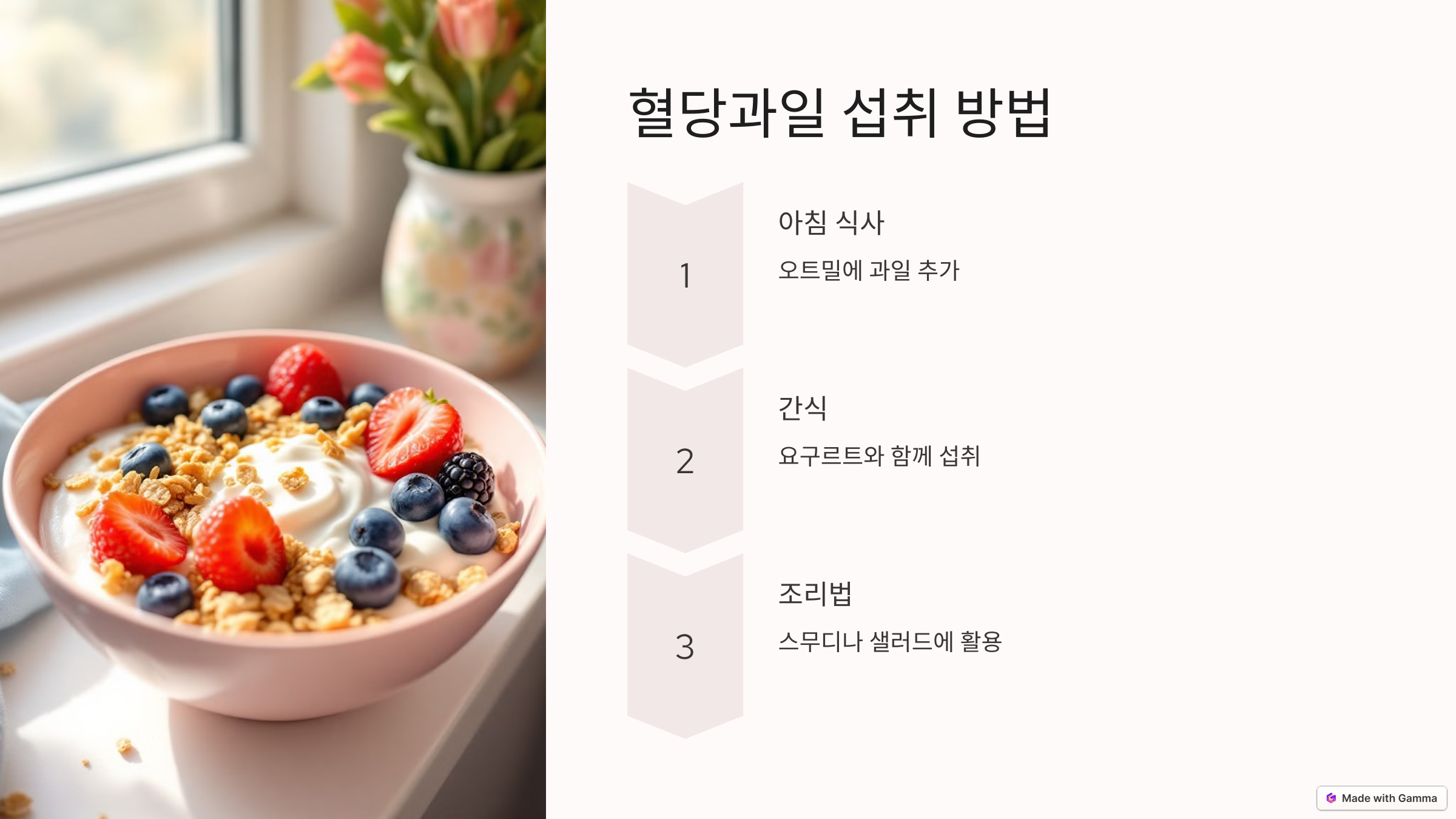 혈당과일은 아침식사나 간식으로 섭취하는 것이 좋습니다. 이들은 우리의 몸에 필요한 에너지를 공급하며, 혈당 수치를 안정적으로 유지하는 데 기여합니다. 또한, 다양한 조리법으로 즐길 수 있어 식사에 재미를 더해줍니다.