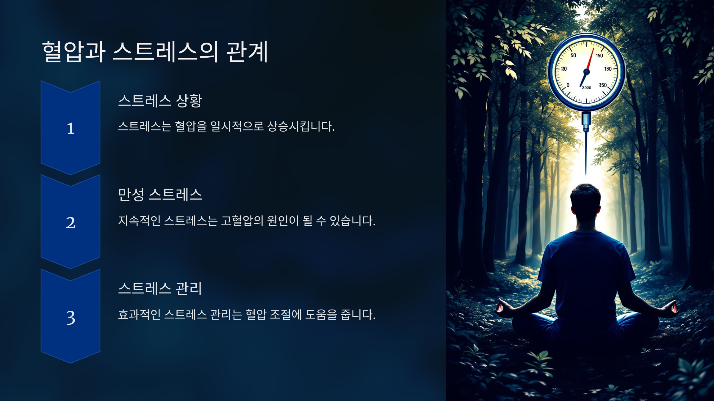 높은 혈압은 스트레스와 밀접한 관련이 있습니다. 스트레스가 쌓이면 혈압이 상승하는 것은 마치 압력이 가해진 풍선과 같습니다. 결국, 풍선이 터질 수 있습니다. 스트레스를 관리하는 것은 혈압을 낮추는 데 필수적입니다. 명상이나 요가와 같은 방법이 도움이 될 수 있습니다.