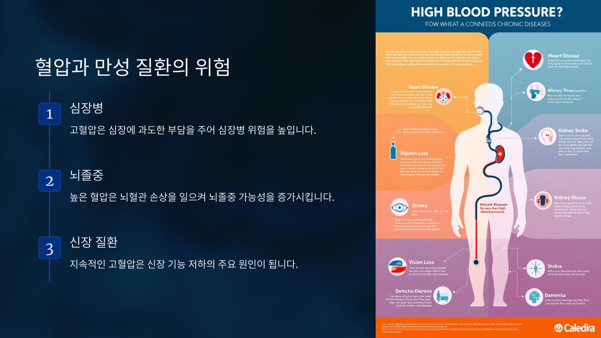 고혈압은 심장병, 뇌졸중 등 다양한 만성 질환의 위험을 증가시킵니다. 이는 마치 불이 번지는 것과 같습니다. 조기에 조치를 취하지 않으면, 큰 화를 부를 수 있습니다. 따라서, 정기적인 혈압 체크는 필수입니다. 작은 문제를 조기에 발견하는 것이 중요합니다.
