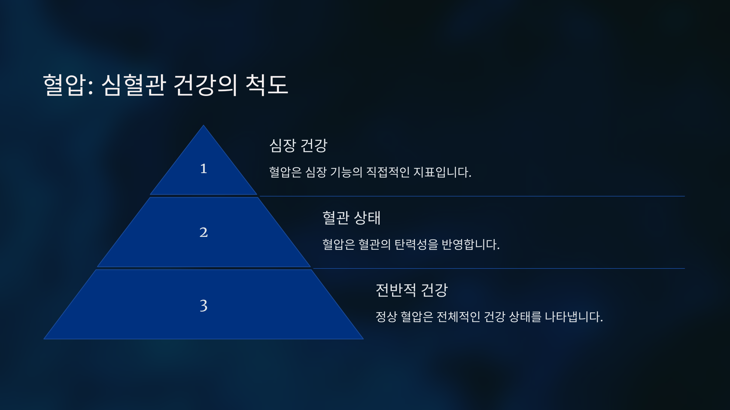 혈압은 심장과 혈관의 건강을 나타내는 중요한 지표입니다. 이는 마치 집의 기초와 같습니다. 기초가 튼튼해야 집이 안전하게 서 있을 수 있습니다. 혈압이 높으면 심장에 과도한 부담이 가해져, 심혈관 질환의 위험이 증가합니다.