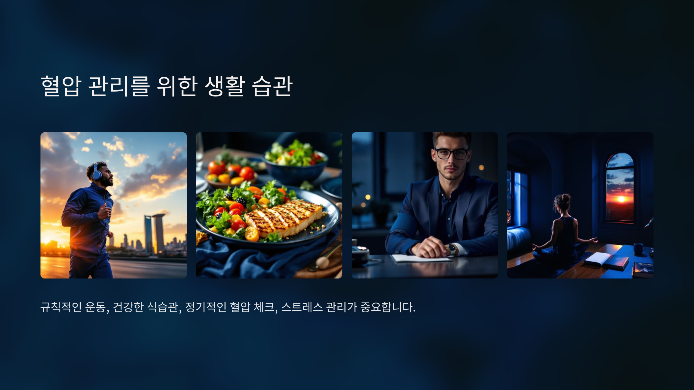 혈압은 우리의 생활 습관에 큰 영향을 받습니다. 규칙적인 운동과 건강한 식습관은 혈압을 낮추는 데 도움을 줍니다. 이는 마치 정원에 물을 주는 것과 같습니다. 꾸준한 관리가 필요합니다. 소금 섭취를 줄이고, 신선한 과일과 채소를 많이 섭취하는 것이 좋습니다.