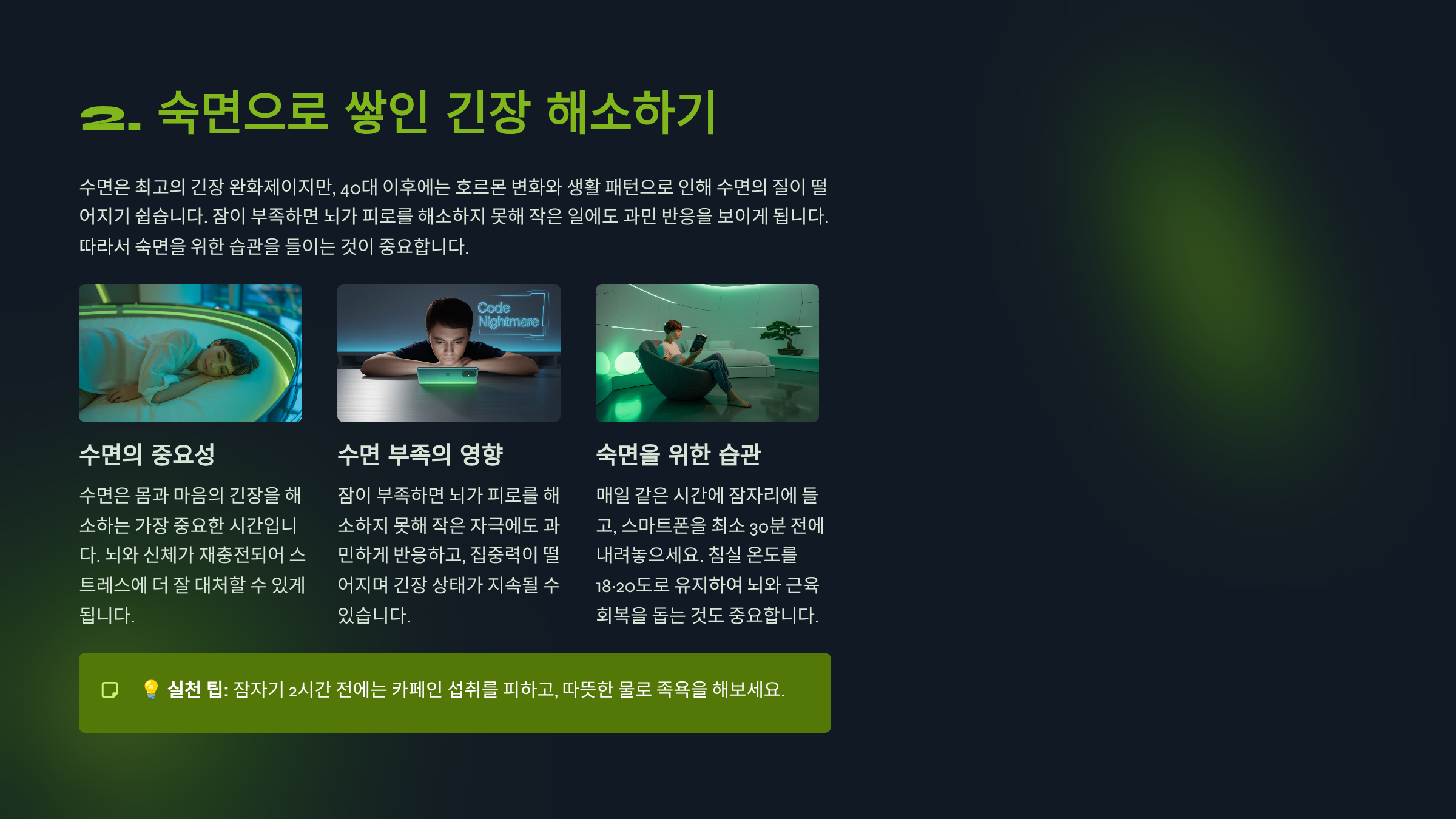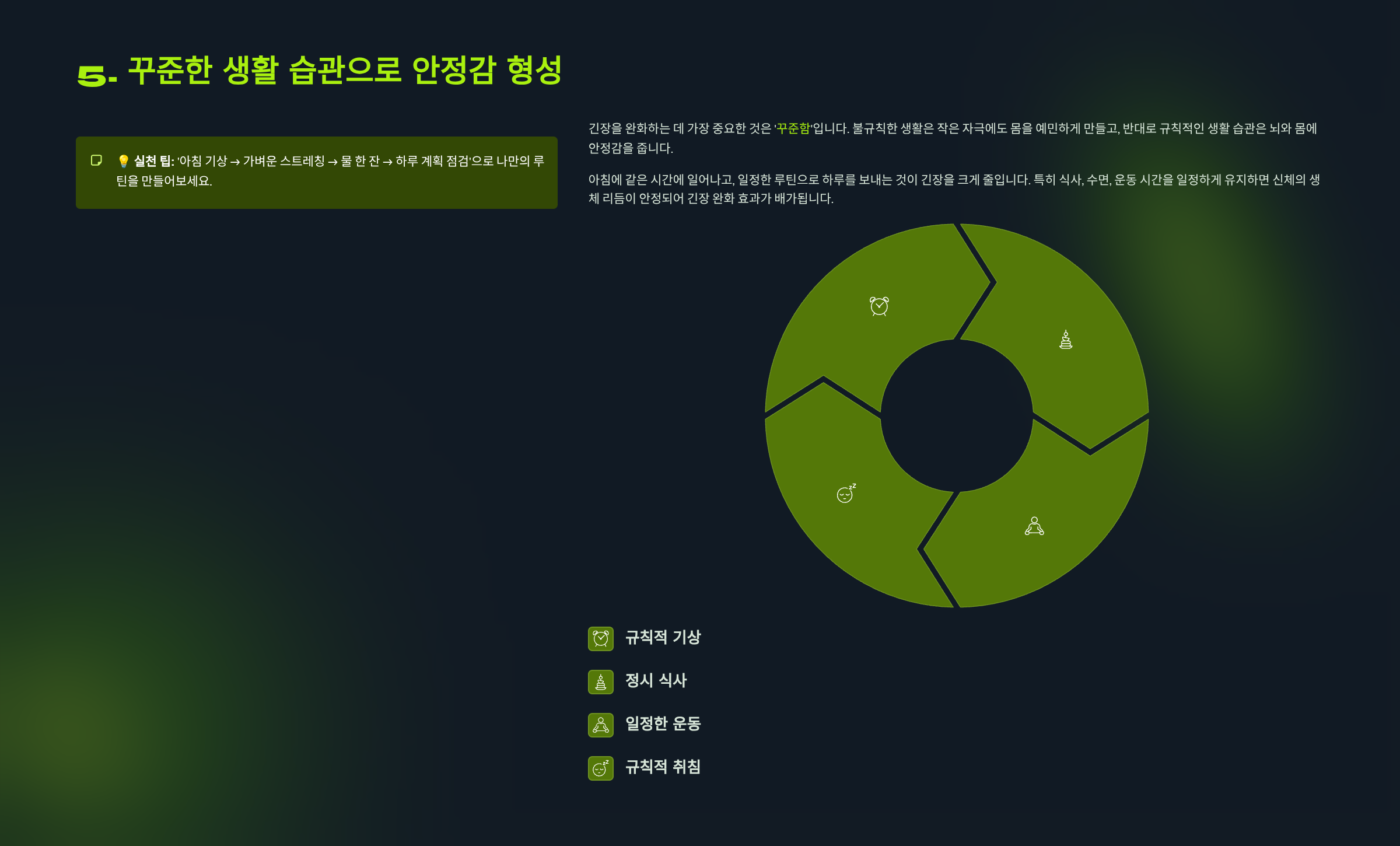 오늘은 긴장을 줄이고 몸과 마음을 안정시키는 생활 습관 관리 5단계를 소개합니다.