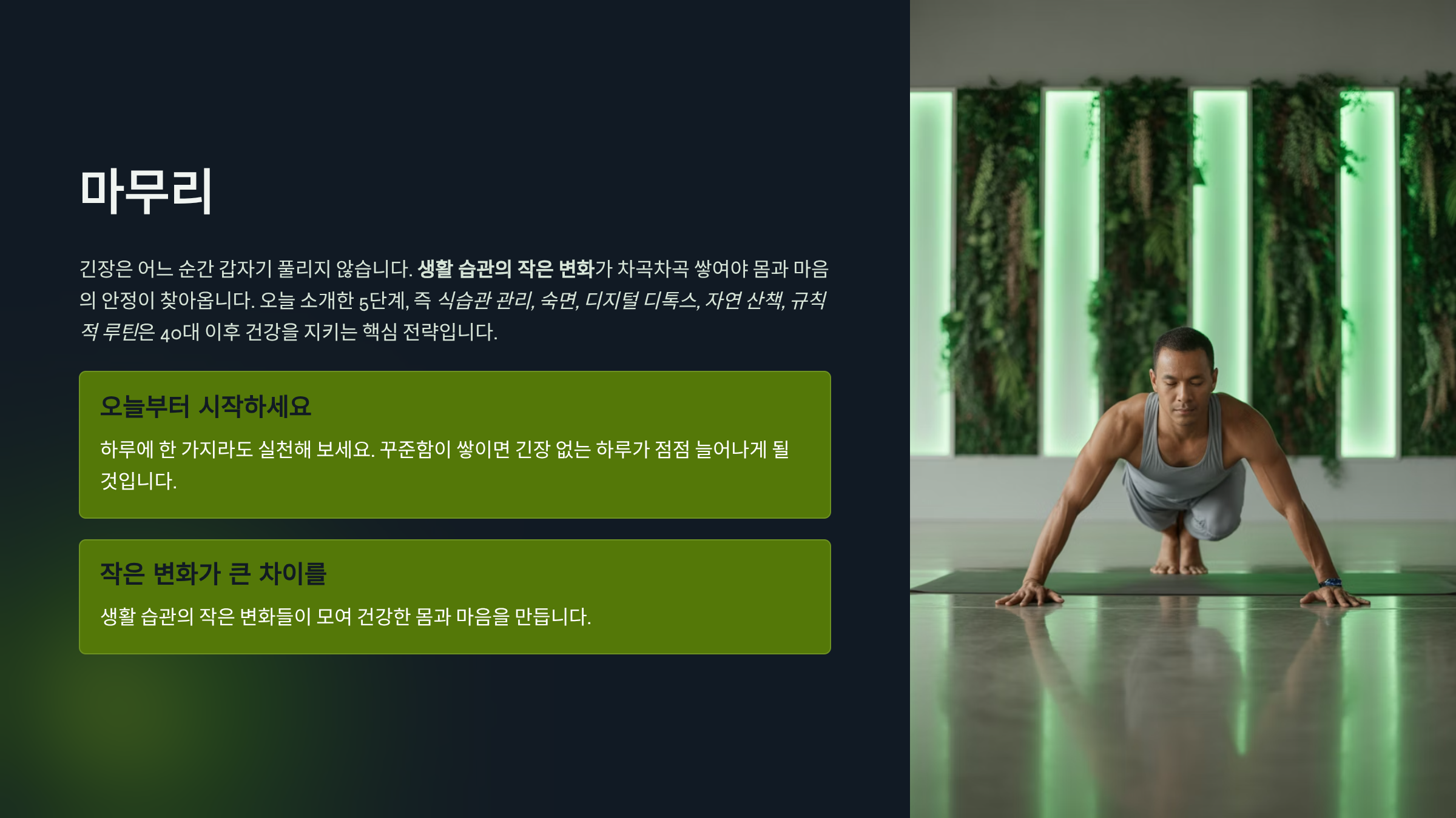 긴장은 어느 순간 갑자기 풀리지 않습니다. 생활 습관의 작은 변화가 차곡차곡 쌓여야 몸과 마음의 안정이 찾아옵니다. 오늘 소개한 5단계, 즉 식습관 관리, 숙면, 디지털 디톡스, 자연 산책, 규칙적 루틴은 40대 이후 건강을 지키는 핵심 전략입니다. 하루에 한 가지라도 실천해 보세요. 꾸준함이 쌓이면 긴장 없는 하루가 점점 늘어나게 될 것입니다.