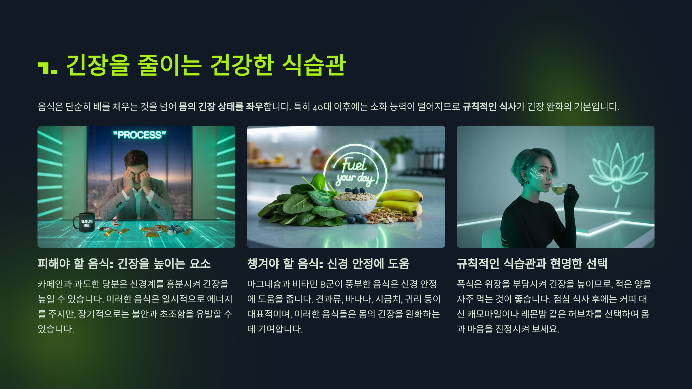 카페인, 과도한 당분은 신경계를 흥분시켜 긴장을 높이고, 반대로 마그네슘과 비타민 B군이 풍부한 음식은 신경 안정에 도움을 줍니다.
