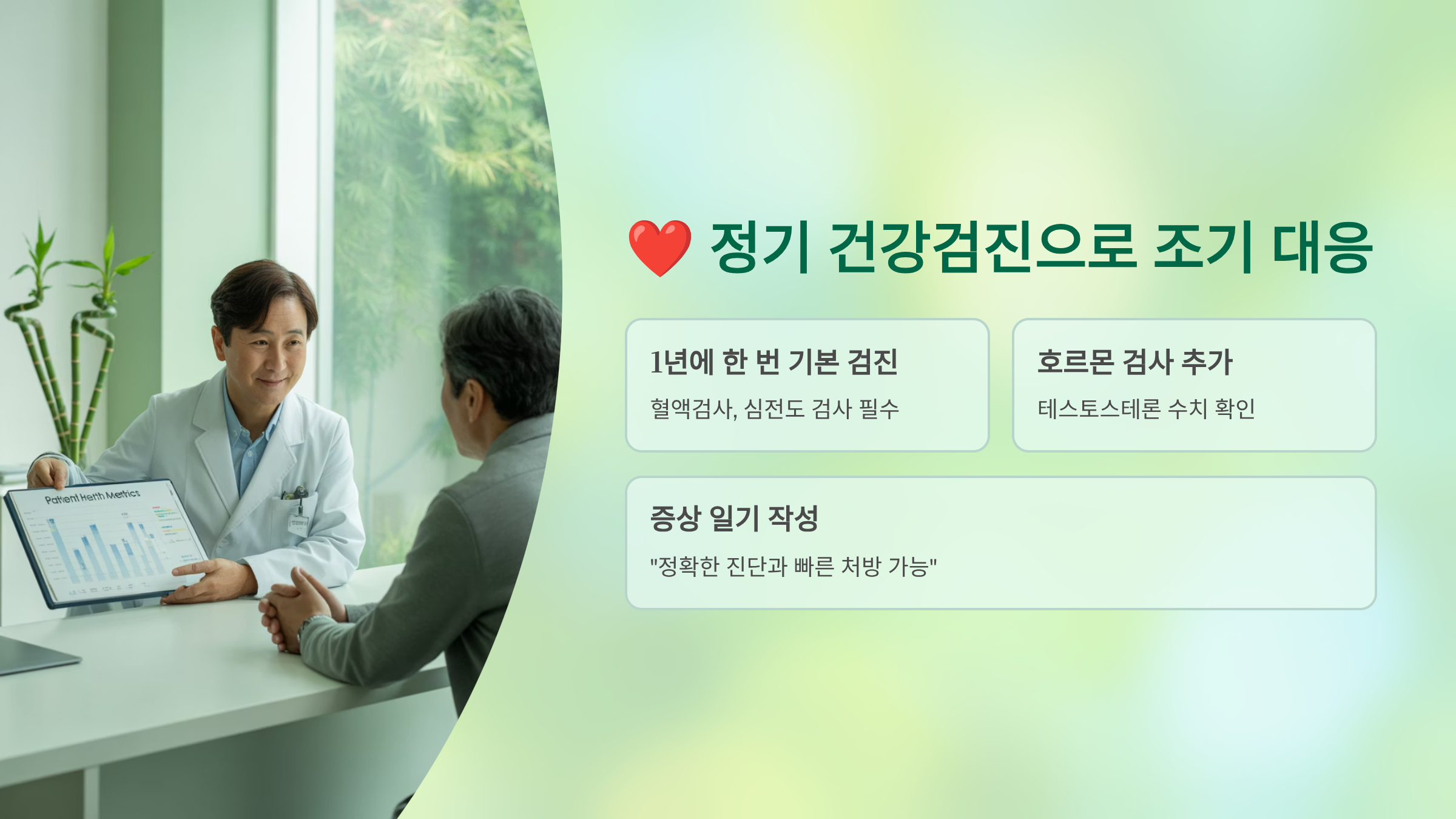 필요하다면 테스토스테론 수치 검사를 추가해 호르몬 밸런스를 확인하세요.