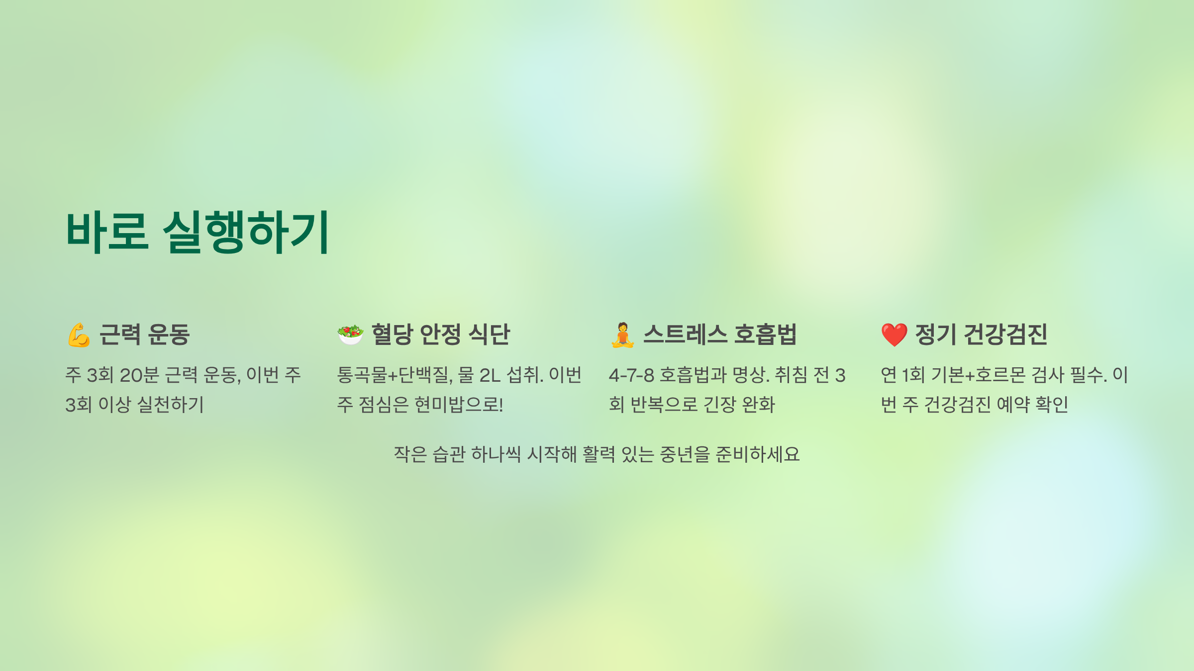 오늘부터 작은 습관 하나씩 시작해 활력 있는 중년을 준비해 보세요.