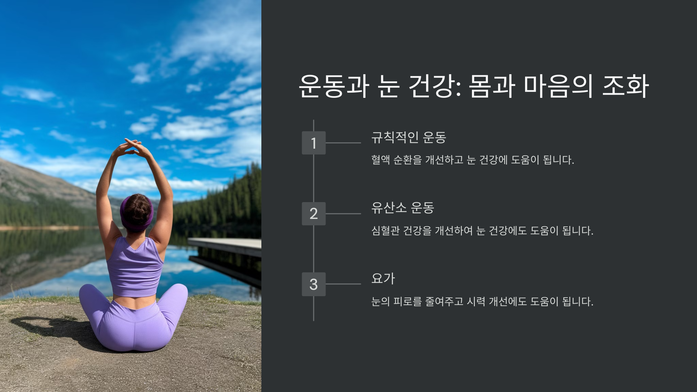 운동은 눈 건강에도 긍정적인 영향을 미칩니다. 규칙적인 운동은 혈액순환을 촉진하고, 산소 공급을 원활하게 하여 눈의 건강을 지켜줍니다. 예를 들어, 유산소 운동이나 요가는 스트레스를 줄이고, 눈의 피로를 완화하는 데 도움을 줍니다. 또한, 자연 속에서의 운동은 눈에 좋은 영향을 미칩니다. 푸른 자연을 바라보며 걷는 것은 눈의 피로를 덜어주고, 마음의 안정을 가져다줍니다.