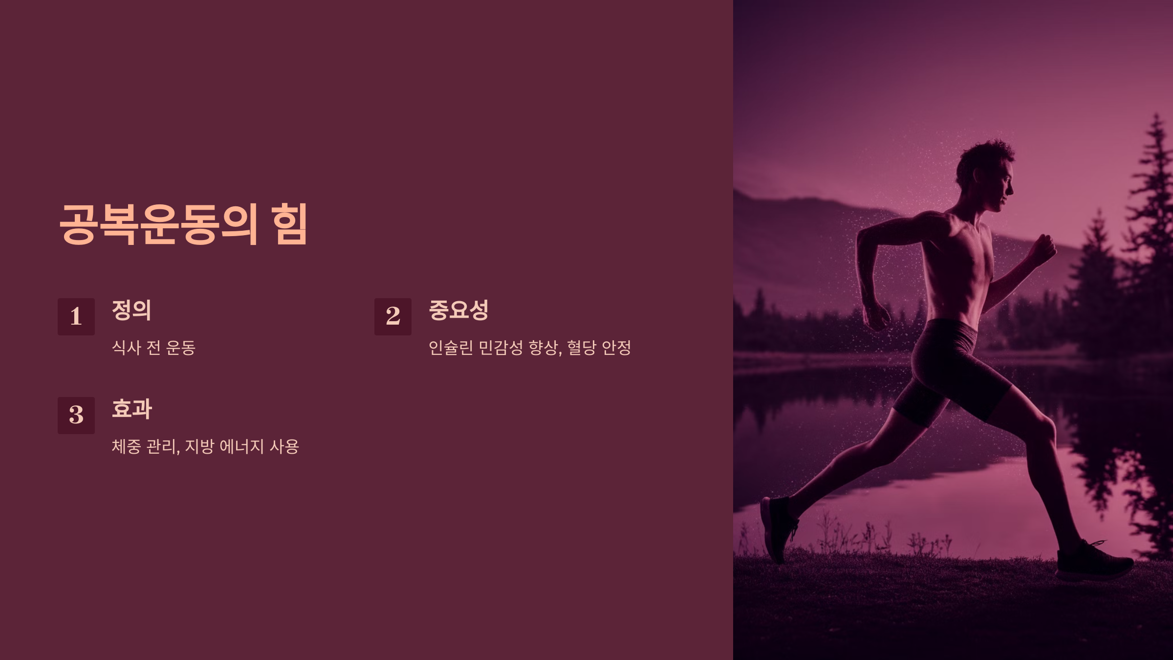 공복운동은 식사 전, 즉 공복 상태에서 이루어지는 운동을 의미합니다. 이 운동은 체내의 인슐린 민감성을 높여주고, 혈당 수치를 안정적으로 유지하는 데 도움을 줍니다. 공복 상태에서 운동을 하면, 체내의 저장된 지방을 에너지원으로 사용하게 되어 체중 관리에도 긍정적인 영향을 미칩니다. 이는 마치 고요한 호수에 돌을 던져 물결을 일으키듯, 공복운동은 몸의 대사에 활력을 불어넣습니다.