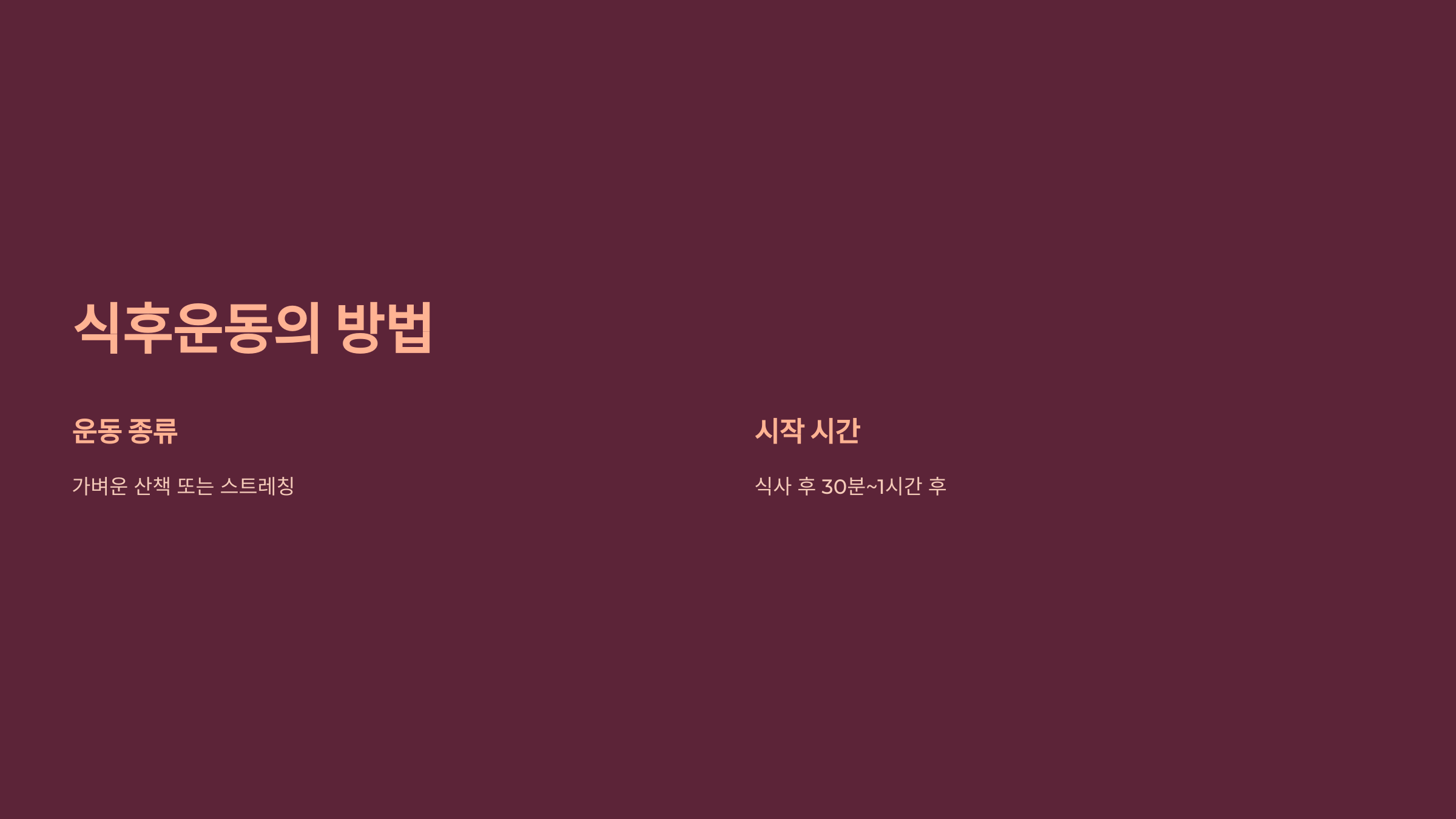 식사 후 30분에서 1시간 정도의 가벼운 산책이나 스트레칭을 추천합니다. 이때, 너무 격렬한 운동은 피하고, 편안한 속도로 진행하는 것이 좋습니다. 예를 들어, 가족과 함께 산책을 하거나, 집안에서 간단한 스트레칭을 하는 것도 좋은 방법입니다.
