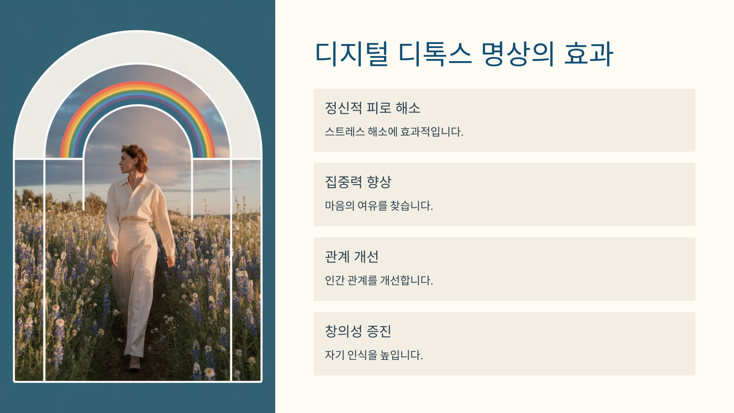디지털 디톡스 명상은 현대인이 겪는 정신적 피로와 스트레스를 해소하는 데 매우 효과적입니다. 마음의 여유를 찾고, 집중력을 향상하며, 인간관계를 개선하고, 창의성을 증진시키고, 자기 인식을 높이는 이 모든 과정은 우리 삶에 긍정적인 변화를 가져옵니다. 따라서, 정기적으로 디지털 디톡스를 실천하여 보다 풍요롭고 행복한 삶을 누리기를 권장합니다.