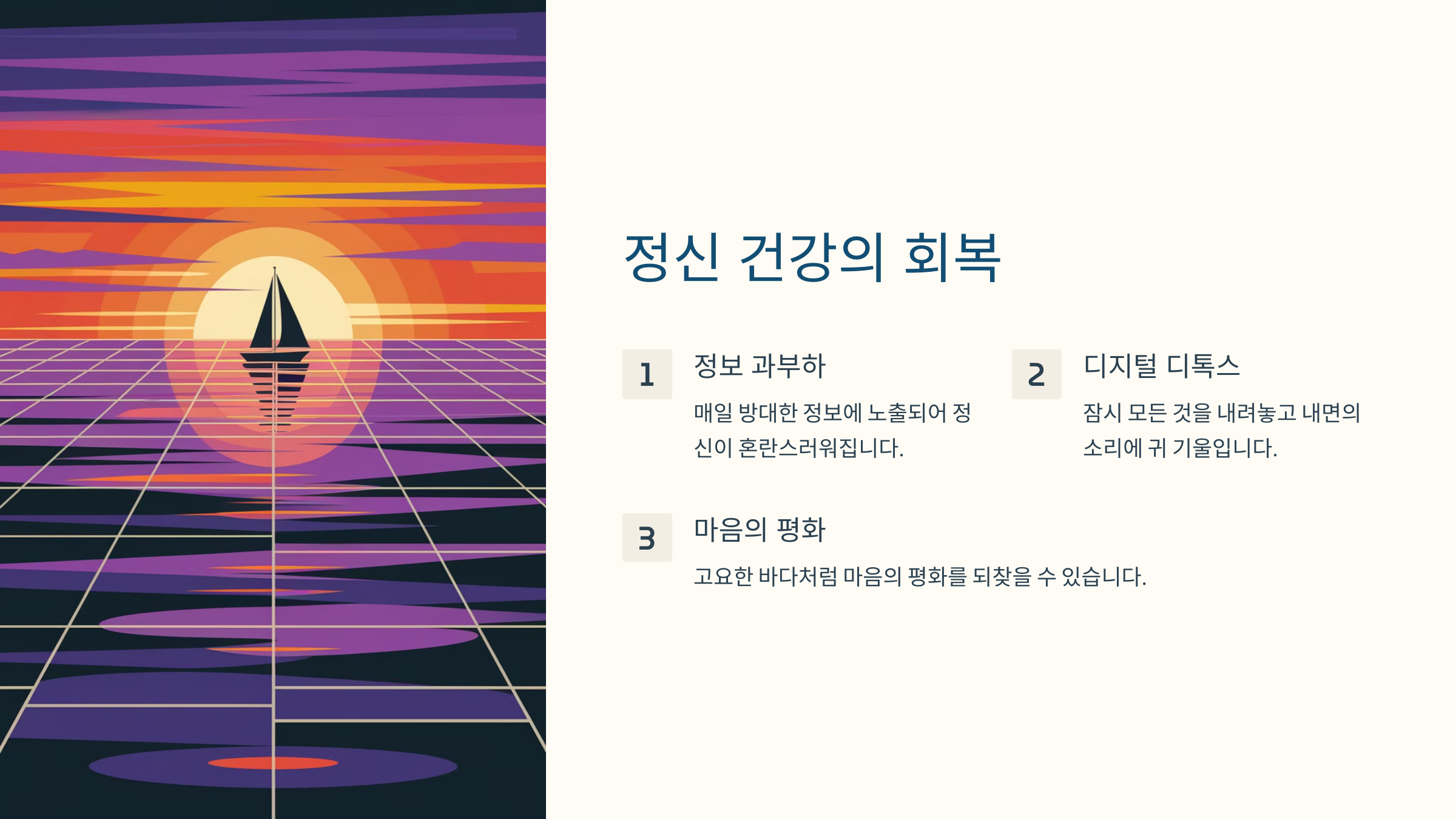 우리가 매일 마주하는 정보의 양은 실로 방대합니다. 뉴스, 소셜 미디어, 메시지 등 다양한 채널을 통해 우리는 끊임없이 자극을 받고 있습니다. 이러한 상황은 가끔 우리의 정신을 혼란스럽게 만들고, 스트레스를 유발하기도 합니다. 디지털 디톡스를 통해 우리는 잠시 모든 것을 내려놓고, 내면의 소리에 귀 기울일 수 있는 기회를 가질 수 있습니다. 마치 고요한 바다에서 파도가 잔잔해지는 순간처럼, 마음의 평화를 되찾을 수 있습니다.