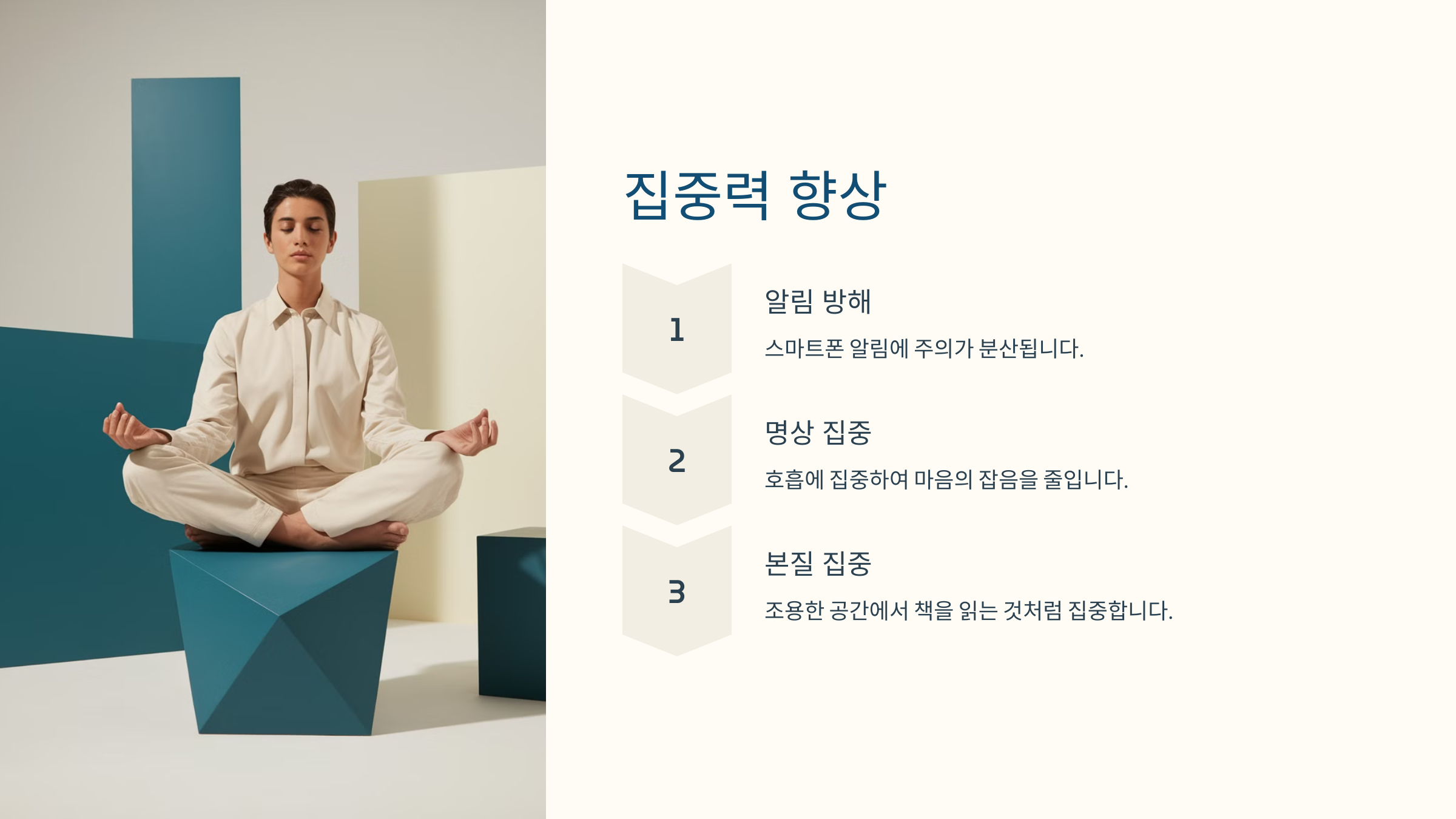 스마트폰을 손에 쥐고 있는 동안 우리는 여러 알림에 휘둘리며 주의가 분산됩니다. 이럴 때 디지털 디톡스 명상을 통해 집중력을 회복할 수 있습니다. 명상 중에는 호흡에 집중하거나 주변의 소리에 귀 기울이면서, 마음의 잡음을 줄이고 본질에 집중하는 법을 배울 수 있습니다. 이는 마치 방 안의 불필요한 소음을 없애고, 조용한 공간에서 책을 읽는 것과 같습니다.