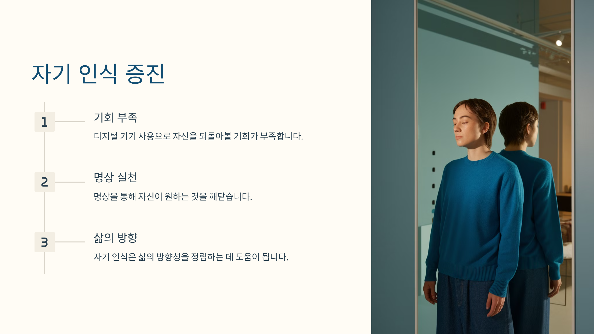 디지털 기기를 사용하지 않으면 우리는 진정한 자신을 되돌아볼 기회를 갖게 됩니다. 명상을 통해 자신이 원하는 것과 필요로 하는 것이 무엇인지 깨닫게 됩니다. 이는 마치 거울을 통해 자신의 모습을 다시 확인하는 것과 같습니다. 이러한 자기 인식은 삶의 방향성을 정립하는 데 큰 도움이 됩니다. 우리가 무엇을 원하고, 어떤 삶을 살아가고 싶은지에 대한 명확한 인식을 가져다줍니다.