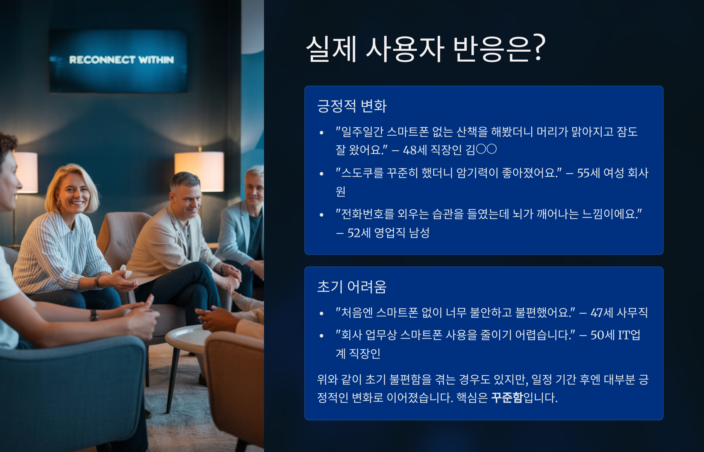 - 부정 리뷰: “처음엔 스마트폰 없이 너무 불안하고 불편했어요.” – 47세 사무직