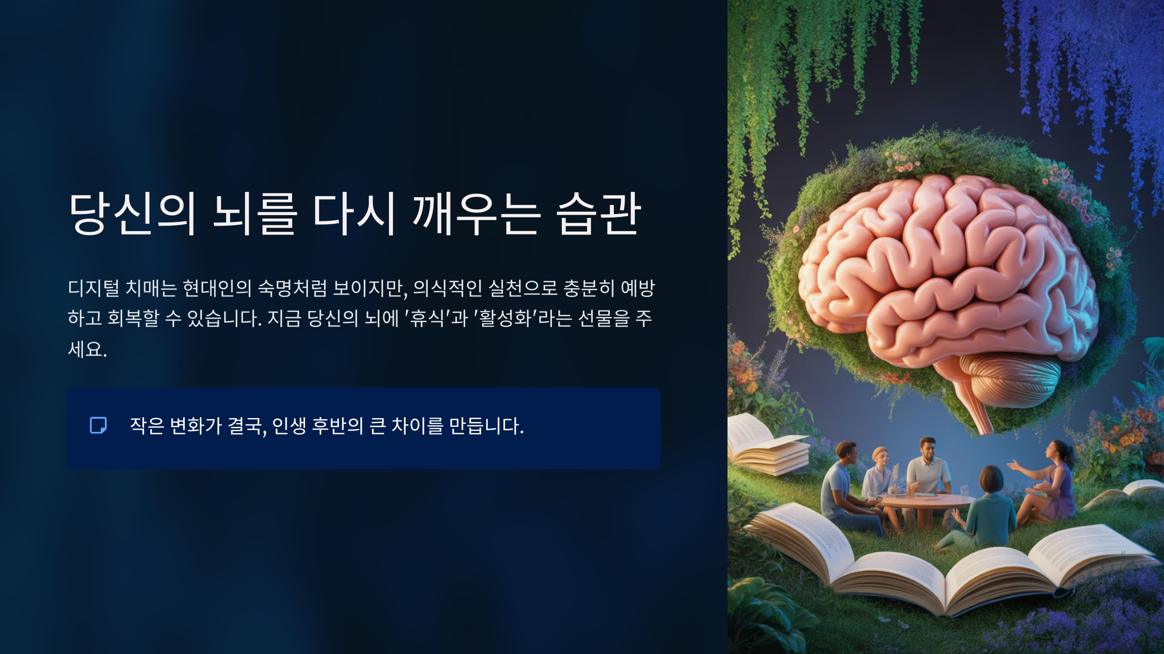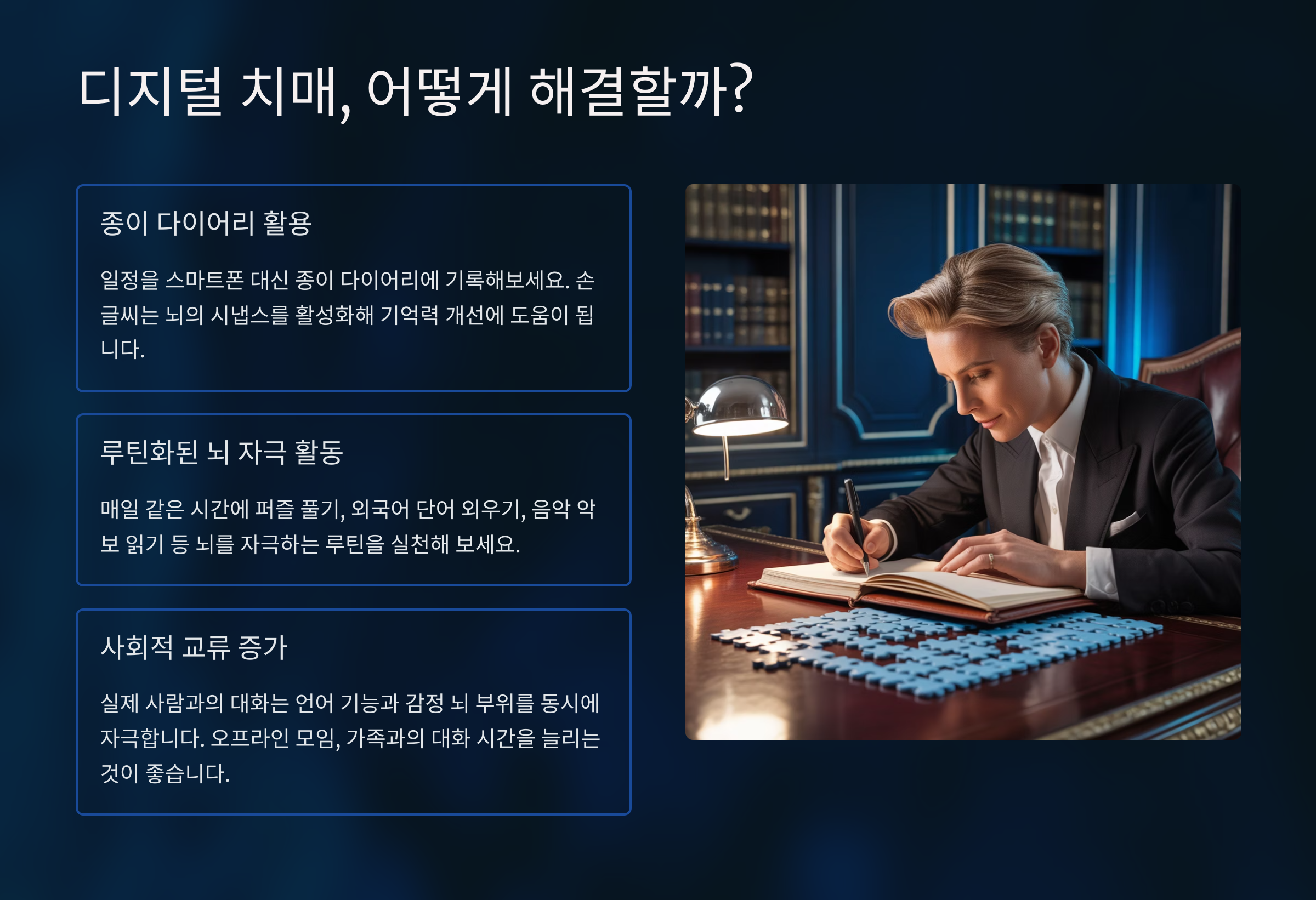 디지털 치매는 현대인의 숙명처럼 보이지만, 의식적인 실천으로 충분히 예방하고 회복할 수 있습니다. 지금 당신의 뇌에 '휴식'과 '활성화'라는 선물을 주세요. 작은 변화가 결국, 인생 후반의 큰 차이를 만듭니다.