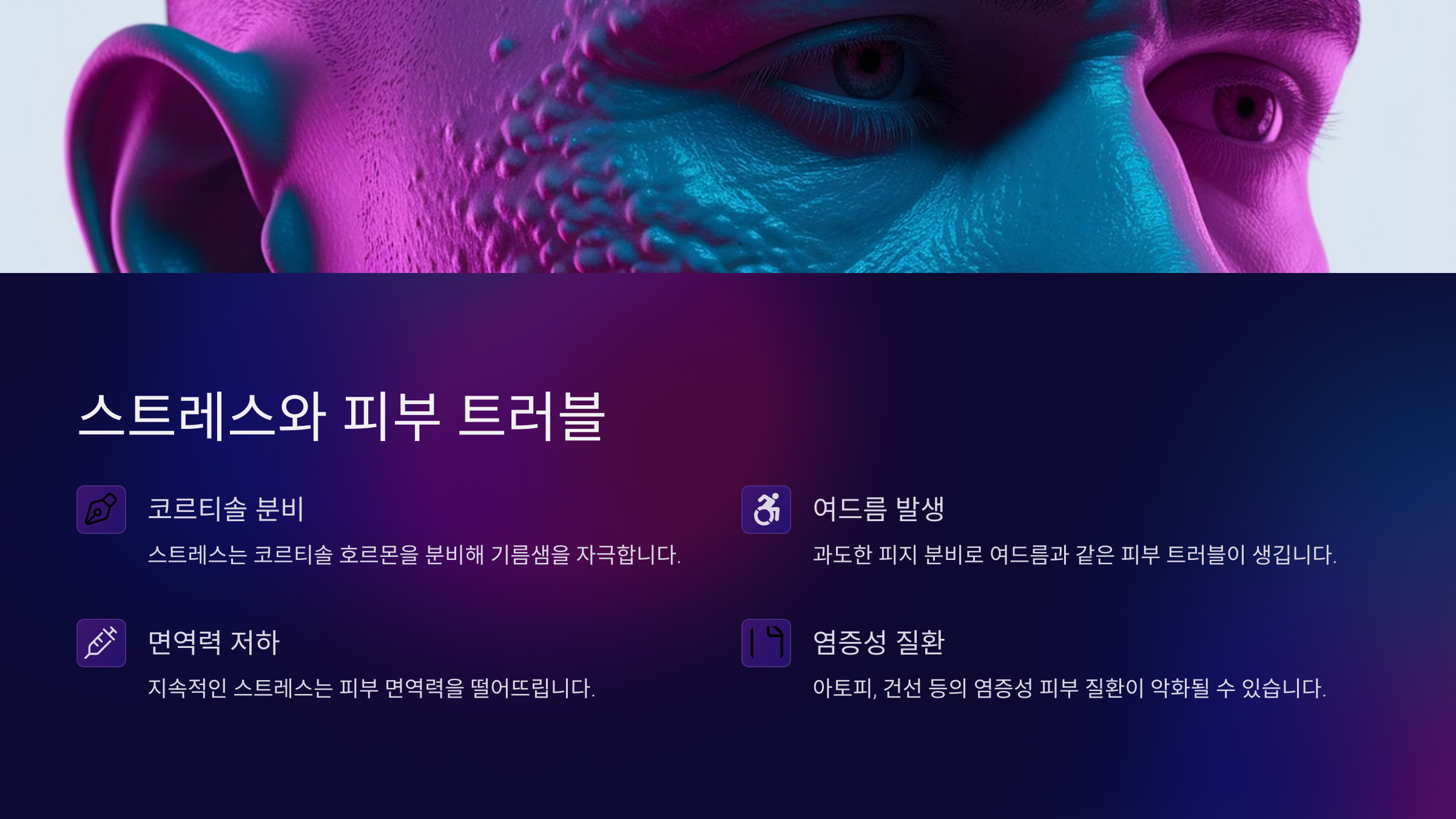 직장인들이 겪는 일상의 스트레스는 피부 건강에 큰 영향을 미칠 수 있습니다. 업무에서 오는 압박감, 가족과의 일상적인 갈등, 바쁜 일정 등은 모두 피부에 나타나는 문제를 악화시킬 수 있는데요. 스트레스가 피부에 미치는 영향과 이를 효과적으로 관리할 수 있는 방법을 함께 알아보겠습니다.