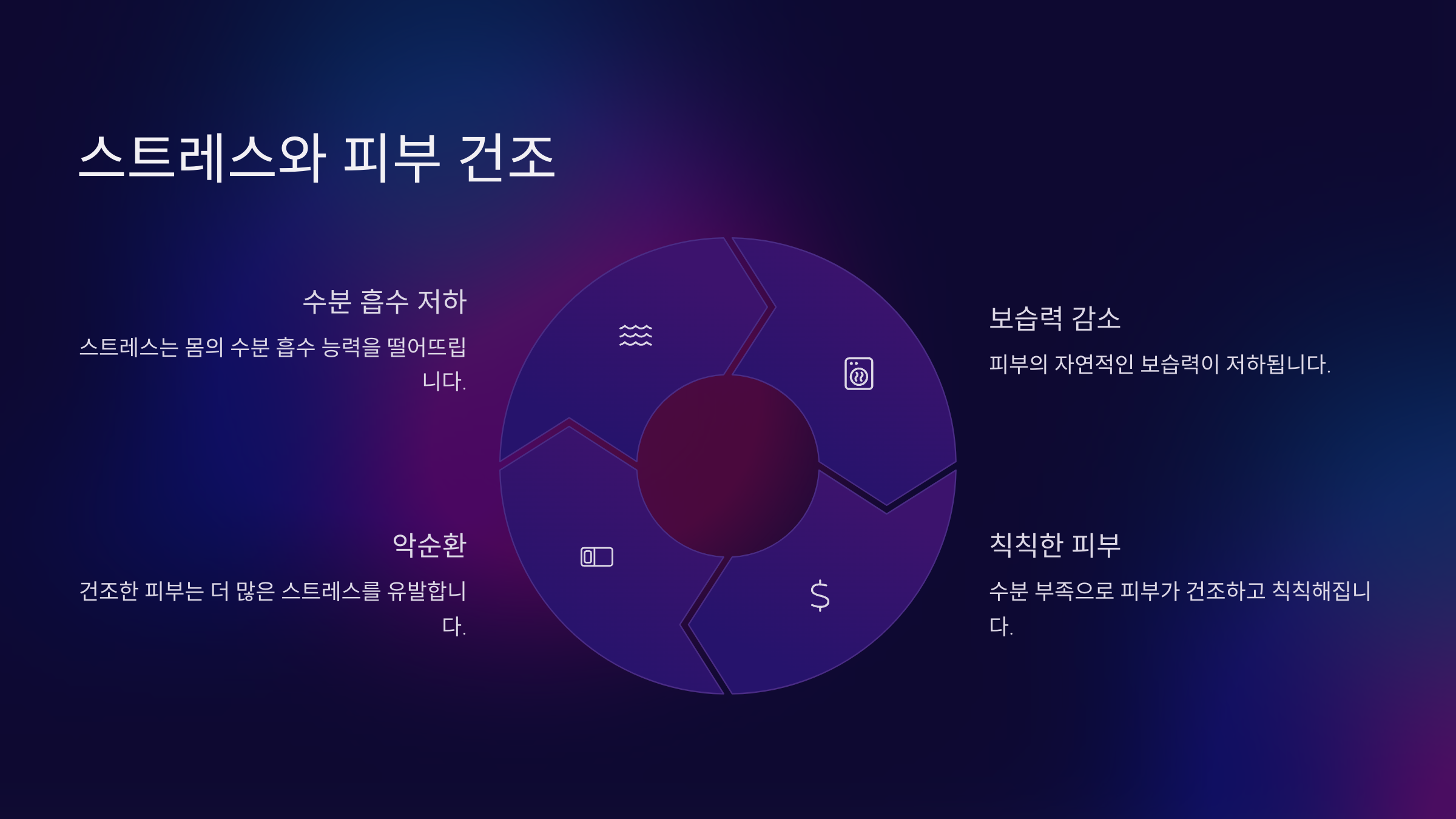 스트레스를 받을 때, 몸이 수분을 제대로 흡수하지 못하게 되면 피부도 건조해질 수 있습니다. 이는 피부의 자연적인 보습력을 떨어뜨리고, 탄력 있게 유지되는 피부의 수분도 감소시켜 건조하고 칙칙한 피부를 만들게 됩니다. 따라서 스트레스 해소는 피부를 촉촉하게 유지하는 데 매우 중요합니다.