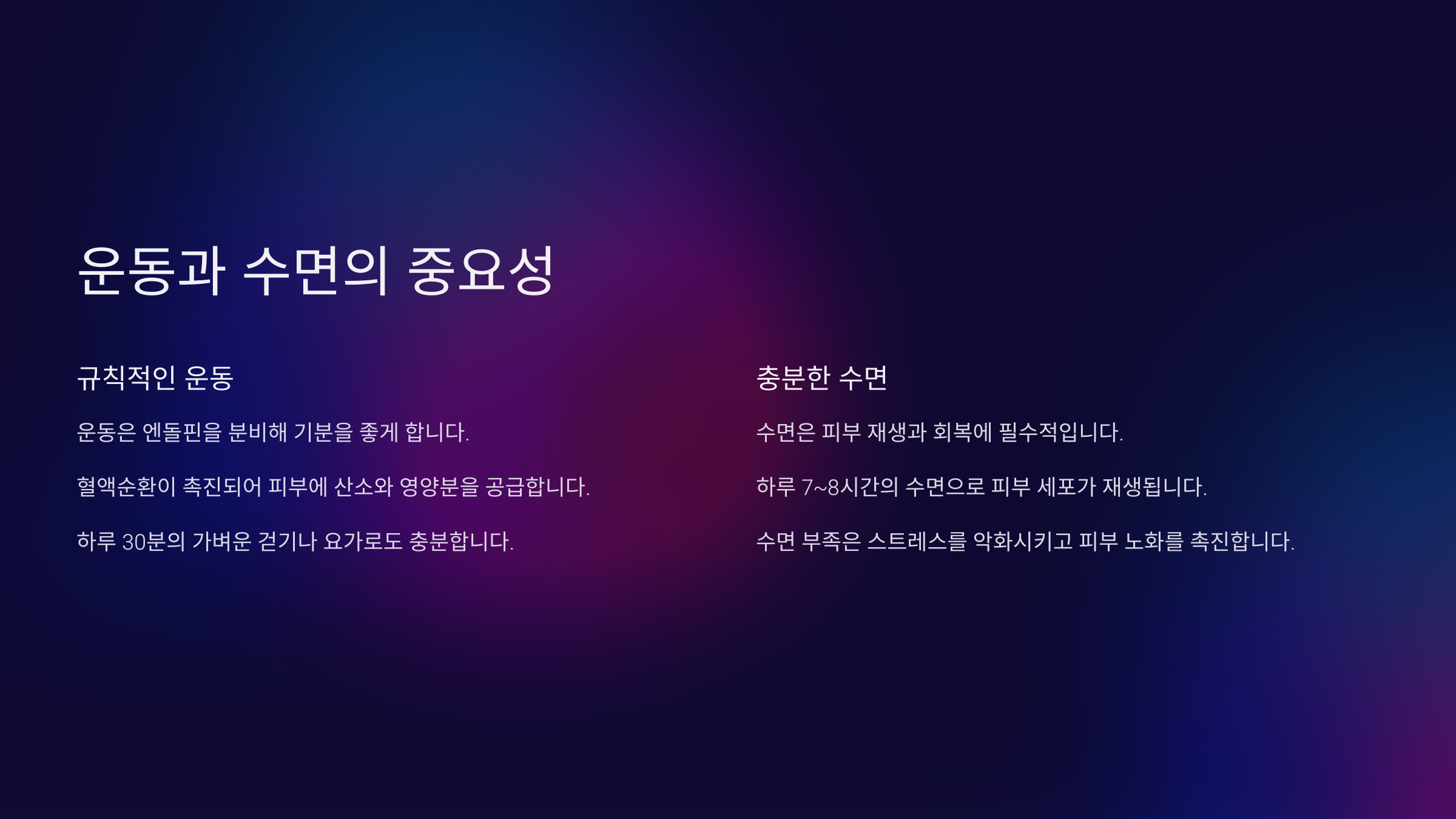 수면은 피부 재생과 회복에 중요한 역할을 합니다. 부족한 수면은 스트레스를 악화시킬 뿐만 아니라 피부 트러블과 노화를 촉진할 수 있습니다. 40대 이상의 직장인들은 바쁜 업무로 수면 시간이 부족한 경우가 많지만, 최소한 하루 7~8시간의 수면을 취하는 것이 피부 건강에 매우 중요합니다. 충분한 수면을 통해 스트레스 해소뿐만 아니라 피부 세포 재생이 이루어져 건강하고 빛나는 피부를 유지할 수 있습니다.