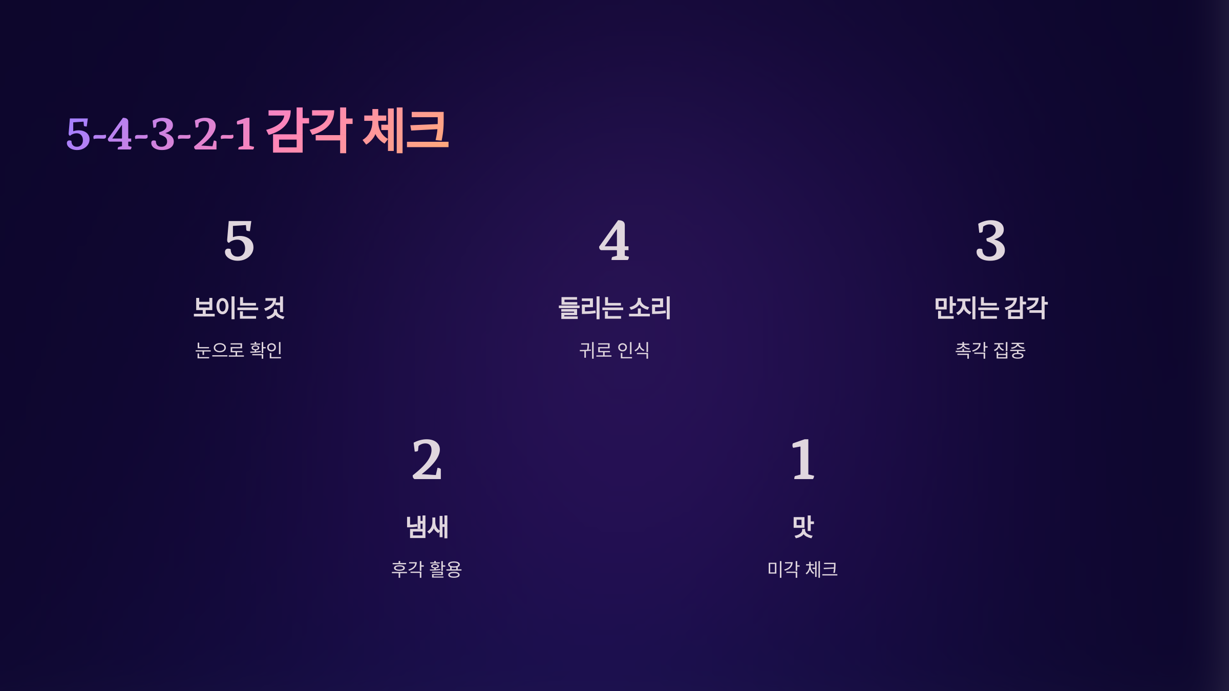 불안하거나 감정이 흔들릴 때는 오감에 집중해 현재에 머무는 것이 중요합니다. 눈에 보이는 것 5가지, 들리는 소리 4가지, 만지는 감각 3가지, 냄새 2가지, 맛 1가지를 떠올리며 내 감정을 끌어내려보세요.