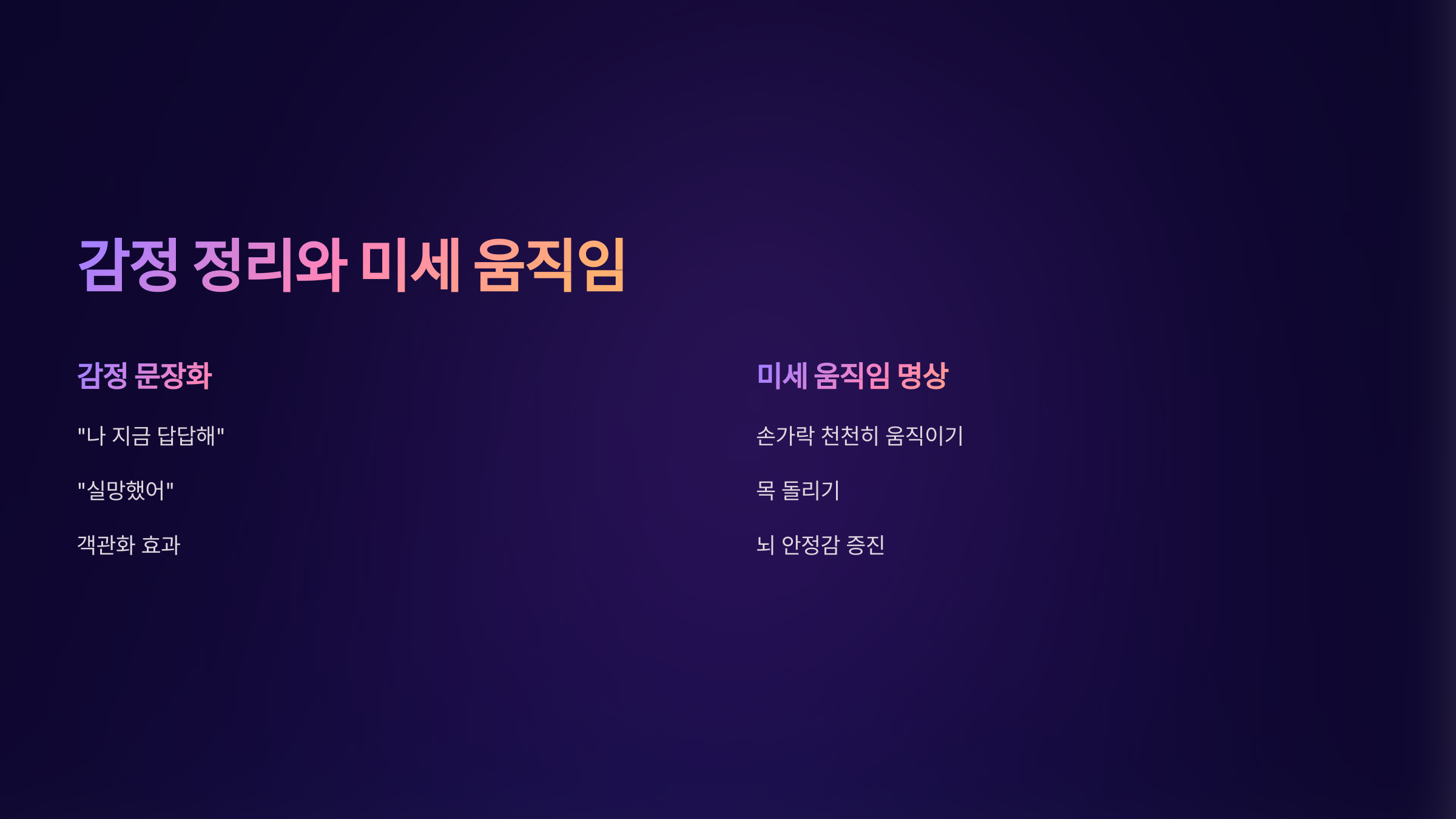 몸을 아주 천천히 움직이며 감각에 집중해 보세요. 손가락을 하나씩 움직이거나, 목을 천천히 돌리는 것만으로도 뇌는 안정감을 느낍니다. ‘느리게 행동하는 것’ 자체가 마음을 진정시키는 강력한 도구입니다.