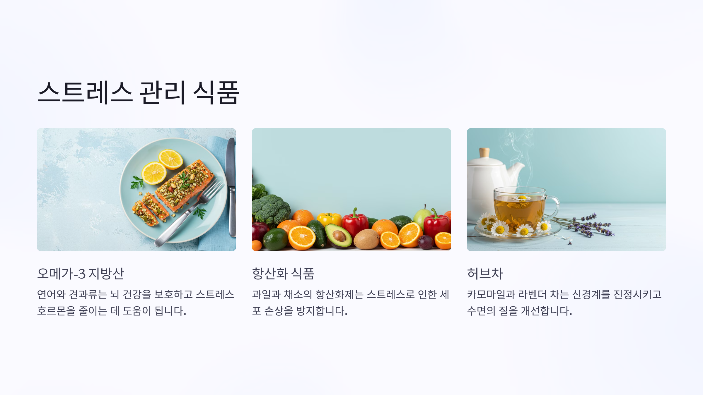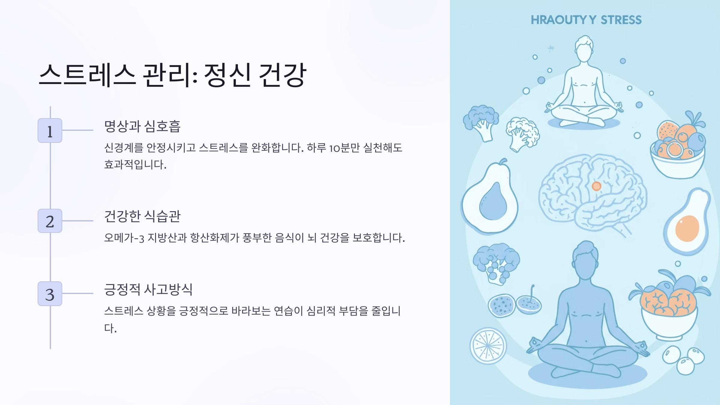 명상과 심호흡은 신경계를 안정시키고 스트레스를 완화하는 데 효과적입니다. 하루 10분 정도라도 깊이 호흡하며 마음을 가라앉혀 보세요.