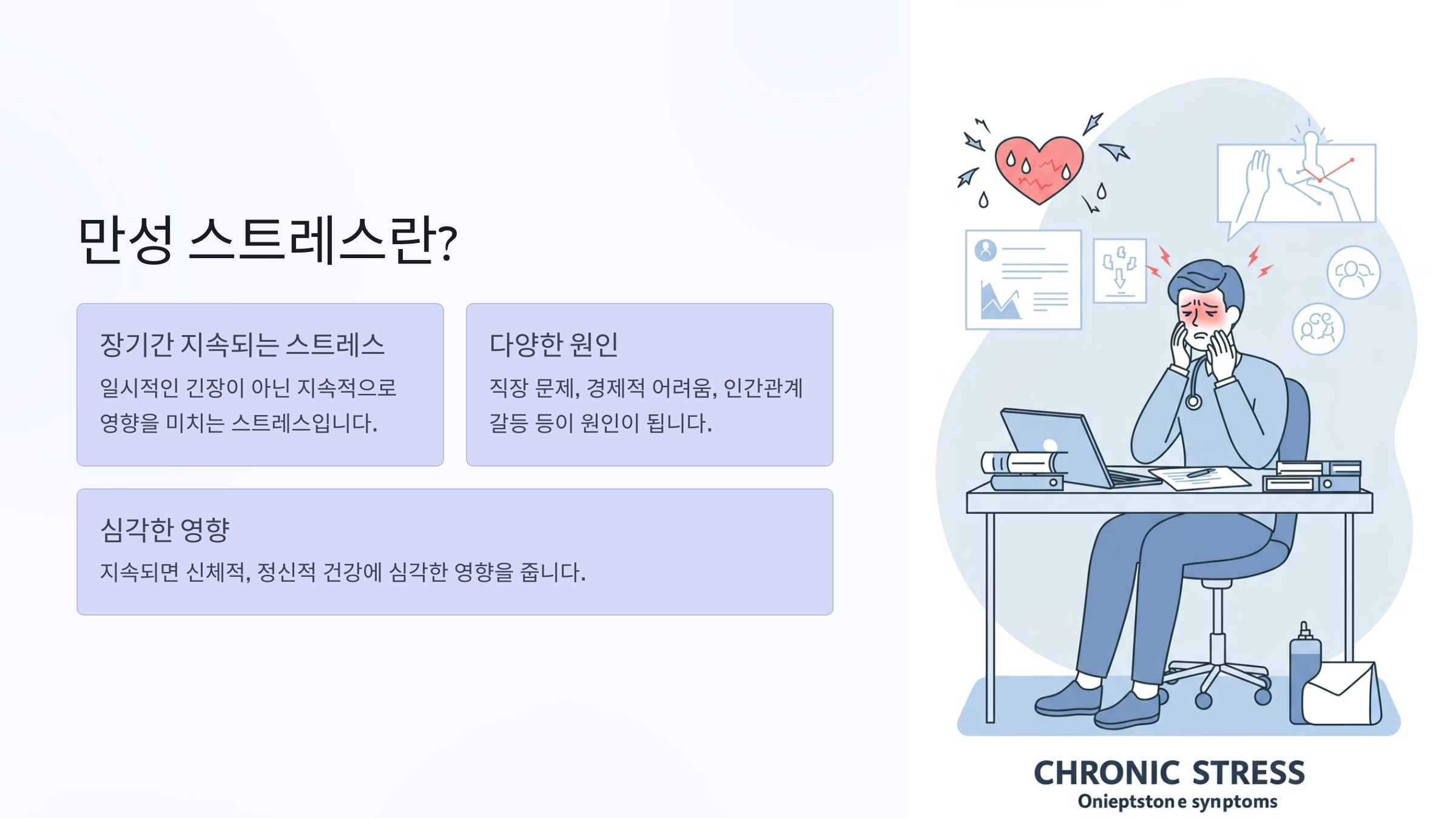 만성 스트레스는 단순한 일시적인 긴장이 아니라, 장기간 지속되는 스트레스를 의미합니다. 직장 문제, 경제적 어려움, 인간관계의 갈등 등 다양한 요인으로 인해 발생할 수 있으며, 지속되면 신체적, 정신적 건강에 심각한 영향을 줄 수 있습니다.