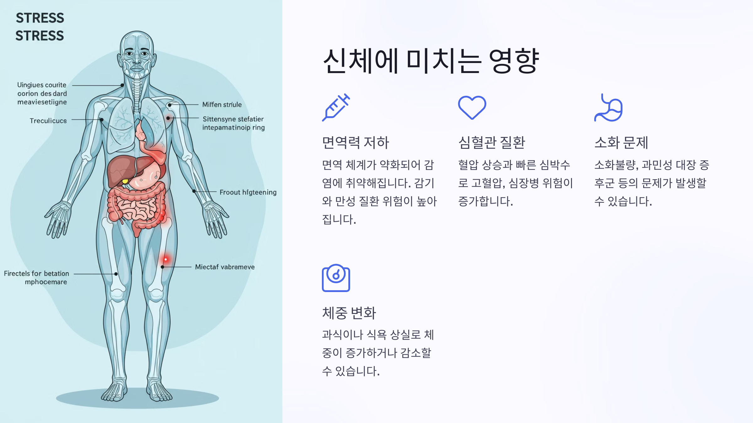 스트레스는 소화기관에도 영향을 미쳐 소화불량, 과민성 대장 증후군(IBS) 등의 문제를 유발할 수 있습니다.