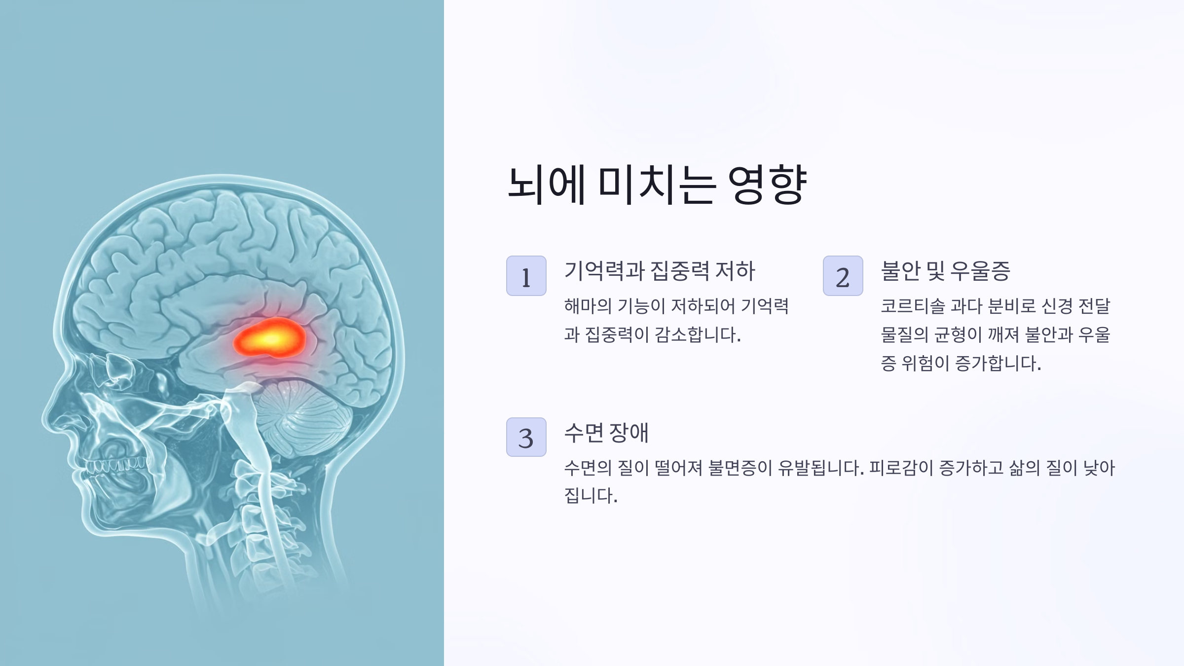 지속적인 스트레스는 해마(기억을 담당하는 뇌 영역)의 기능을 저하시켜 기억력과 집중력을 감소시킬 수 있습니다.