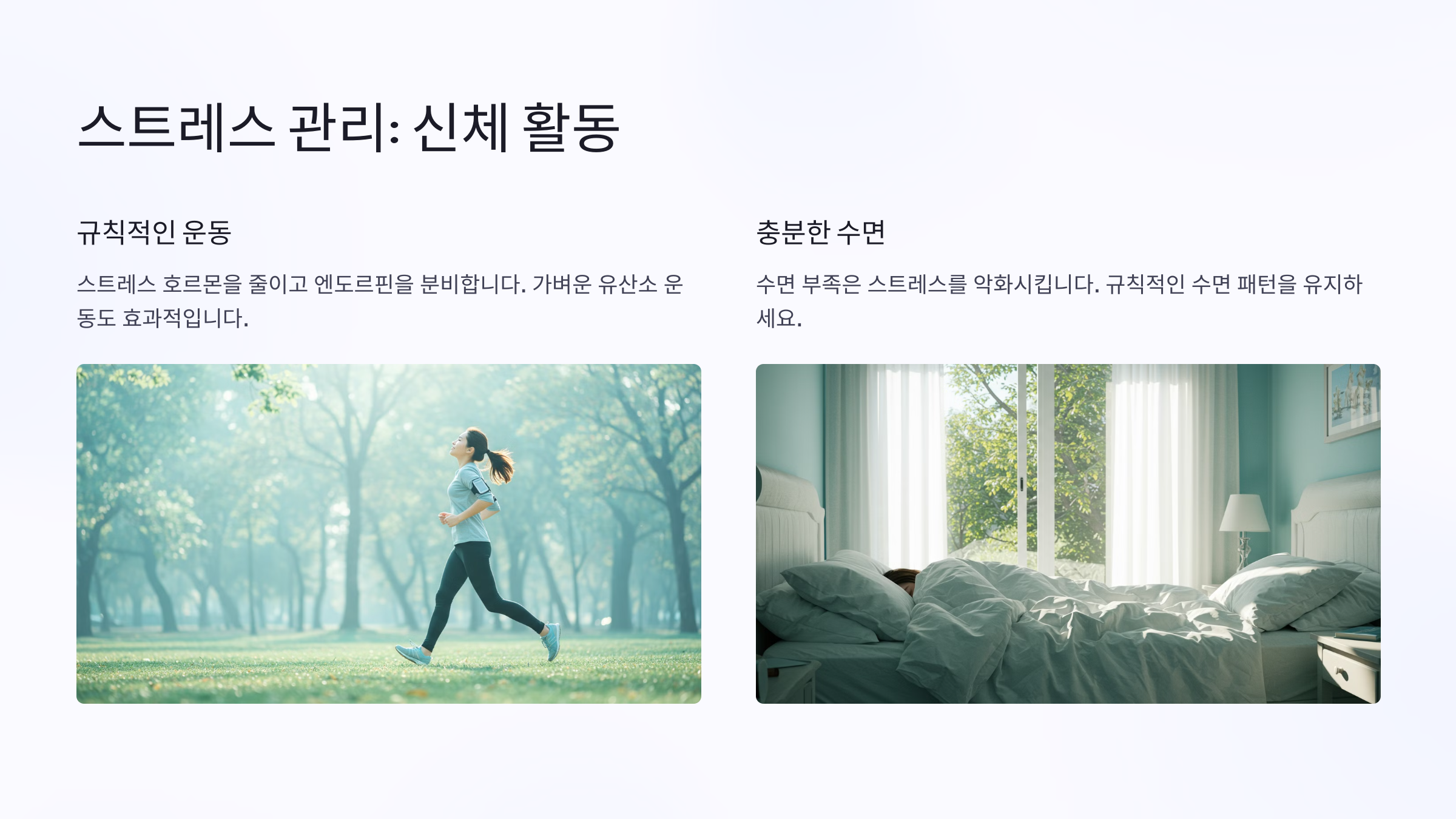 운동은 스트레스 호르몬을 줄이고 기분을 좋게 하는 엔도르핀을 분비하도록 도와줍니다. 가벼운 유산소 운동이라도 꾸준히 하는 것이 중요합니다.