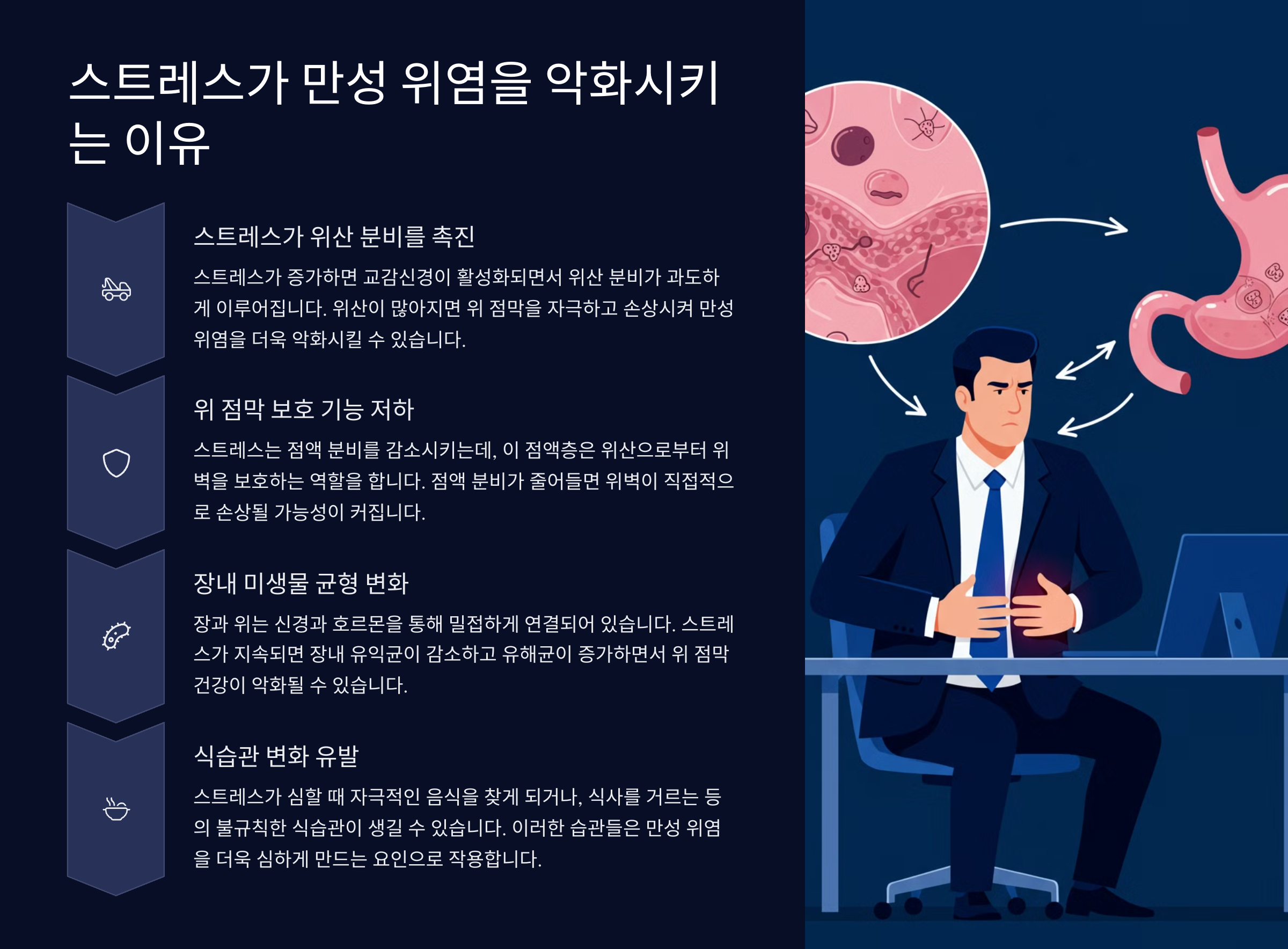 스트레스가 증가하면 교감신경이 활성화되면서 위산 분비가 과도하게 이루어집니다. 위산이 많아지면 위 점막을 자극하고 손상시켜 만성 위염을 더욱 악화시킬 수 있습니다.