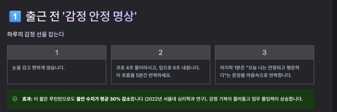 효과: 이 짧은 루틴만으로도 불안 수치가 평균 30% 감소합니다 (2022년 서울대 심리학과 연구). 감정 기복이 줄어들고 업무 몰입력이 상승합니다.