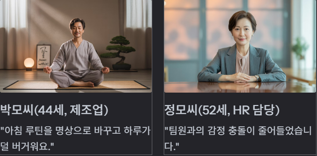 • 박 모 씨(44세, 제조업): “아침 루틴을 명상으로 바꾸고 하루가 덜 버거워요.”