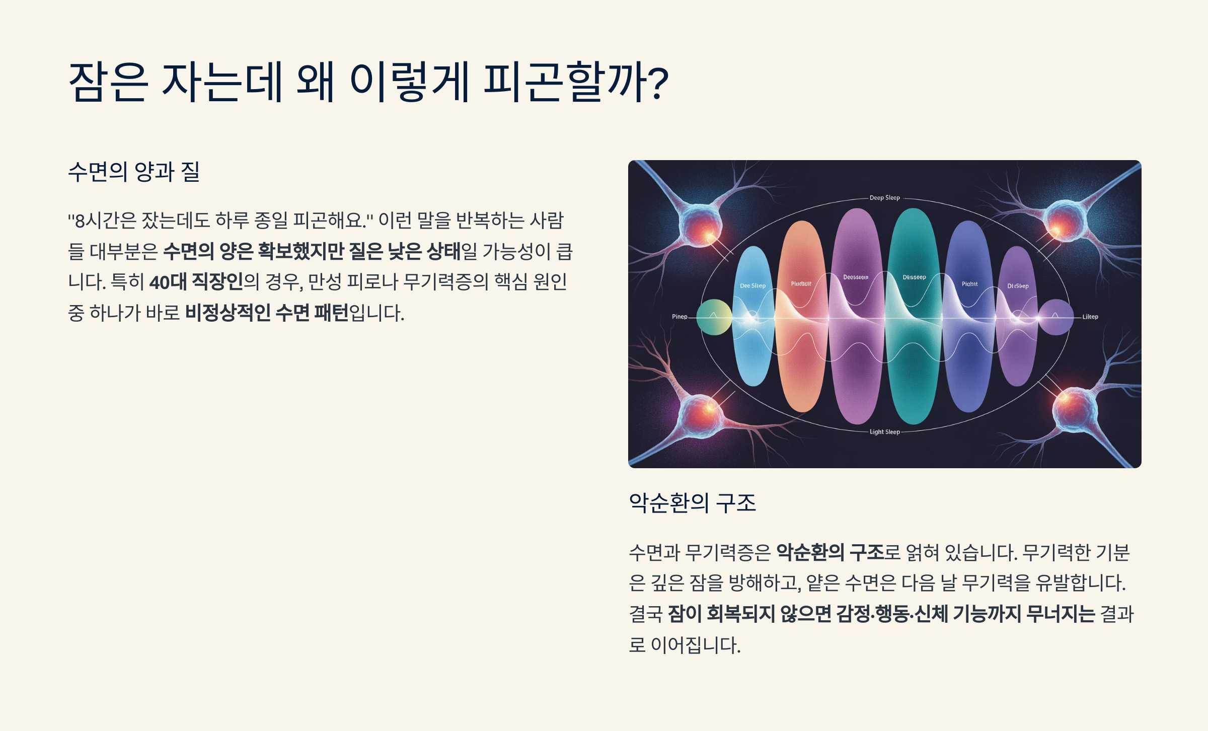 “8시간은 잤는데도 하루 종일 피곤해요.” 이런 말을 반복하는 사람들 대부분은 수면의 양은 확보했지만 질은 낮은 상태일 가능성이 큽니다. 특히 40대 직장인의 경우, 만성 피로나 무기력증의 핵심 원인 중 하나가 바로 비정상적인 수면 패턴입니다.