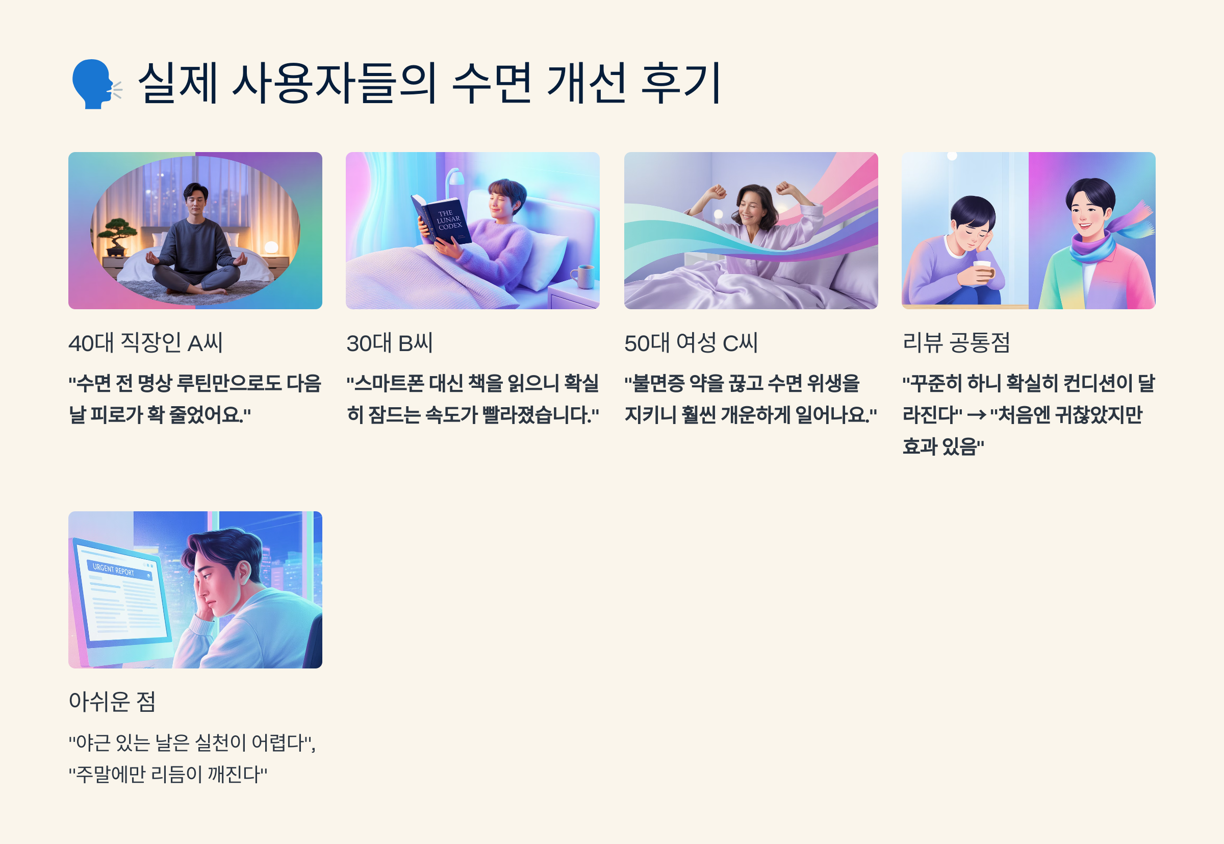 • 40대 직장인 A 씨: “수면 전 명상 루틴만으로도 다음 날 피로가 확 줄었어요.”
