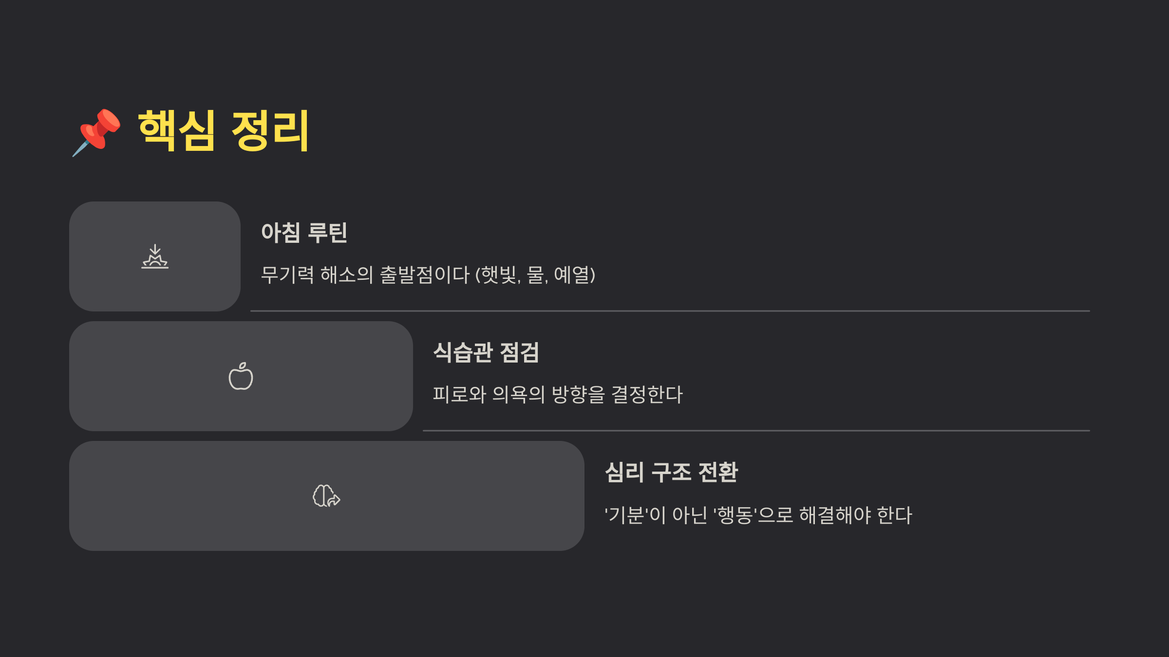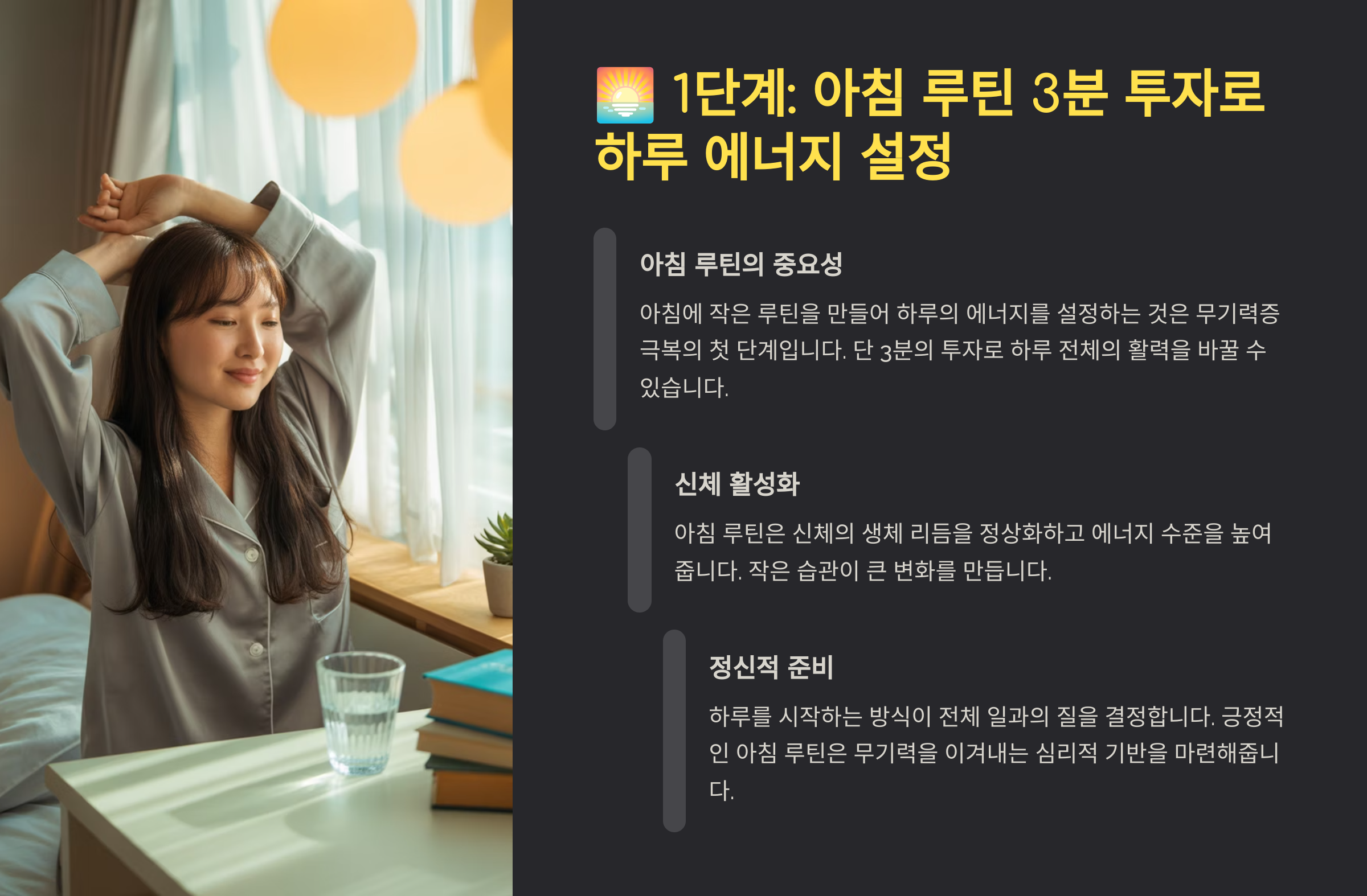 핵심 키워드: 무기력증 극복, 생활 습관, 아침 루틴, 식습관, 심리 회복
